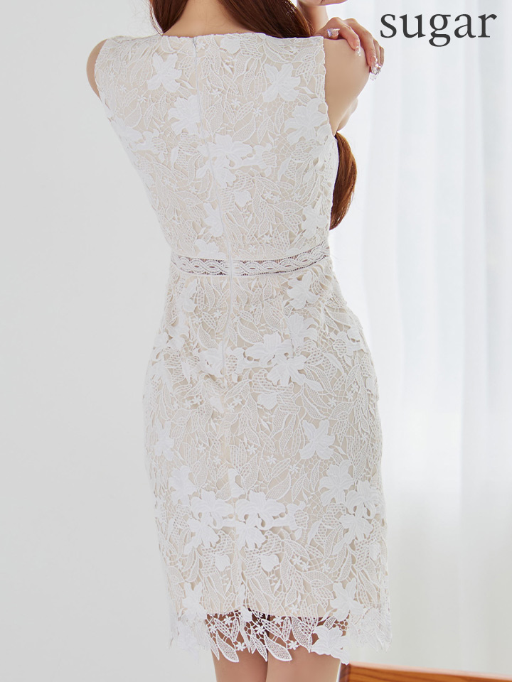 XS-Lサイズあり【ERUKEI エルケイ】フラワー柄/ 総レース/ ハイウエスト切替/ ノースリーブ/ ウエストシースルー/ タイト/ ミニドレス/ キャバドレス[OF2] [LKE25086-W-S2510]