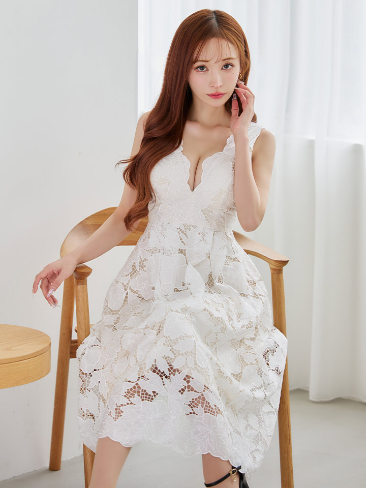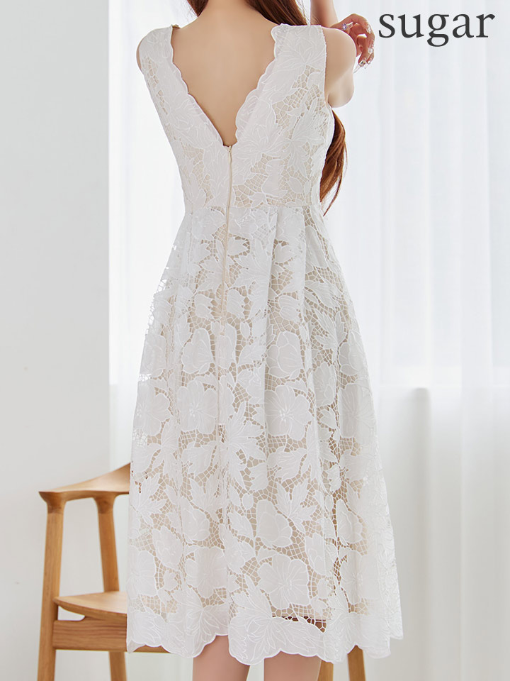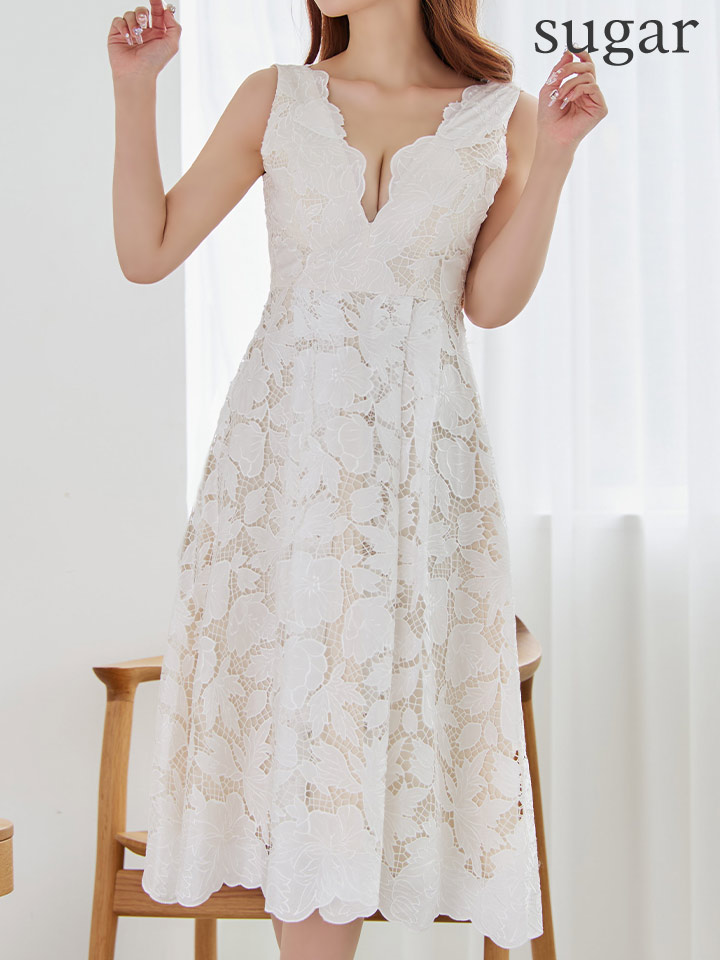 XS-Lサイズあり【SETTAN/セッタン】総レース/ フラワーレース/ Vネック/ ノースリーブ/ Aライン/ フレア/ ミディアムドレス/ キャバドレス[OF2] [LKS25198-W-S2510]
