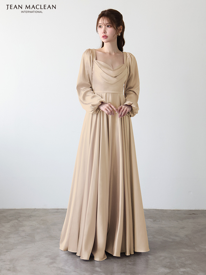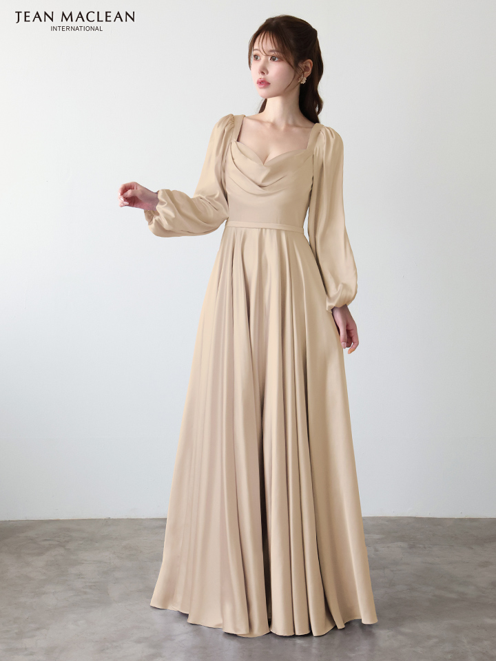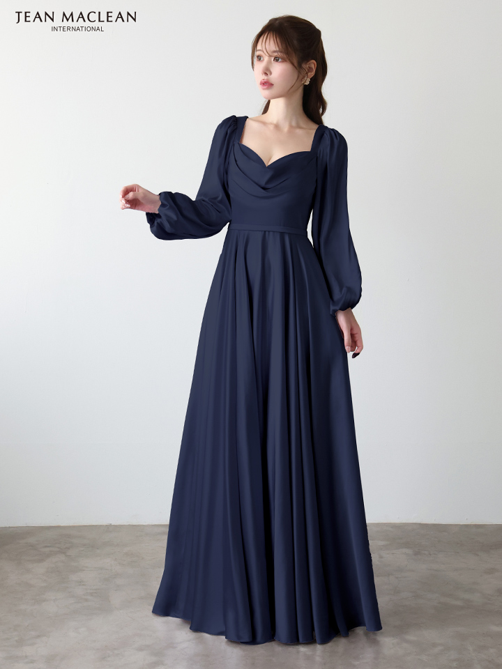 【予約商品/10月下旬-11月上旬発送予定】Lサイズあり【JEAN MACLEAN/ジャンマクレーン】サテン/ バストドレープ/ シンプル/ ワンカラー/ 谷間魅せ/ ロングスリーブ/ ロングドレス/ キャバドレスlong[OF2A] [51952-JM-NV-2510]
