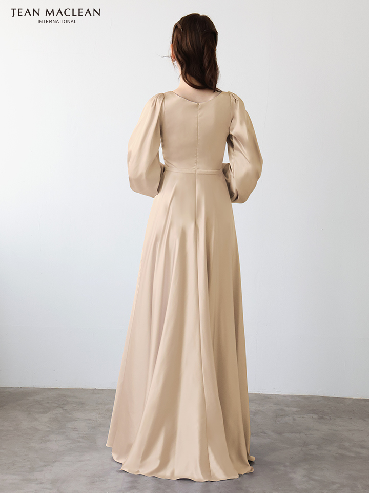 動くたびサテンが光を反射し、上品に艶めくラグジュアリーな一着です。