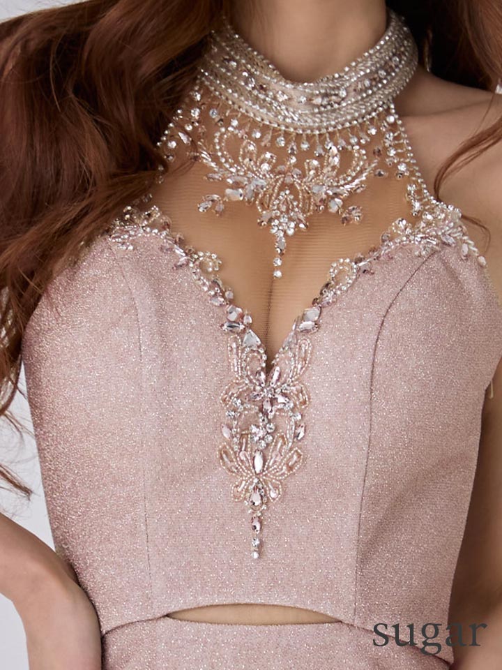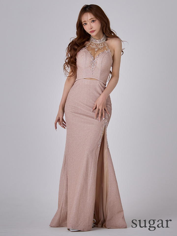 ラメニットに贅沢に散りばめられたビジューが煌めく、ラグジュアリーな雰囲気のロングドレス♡