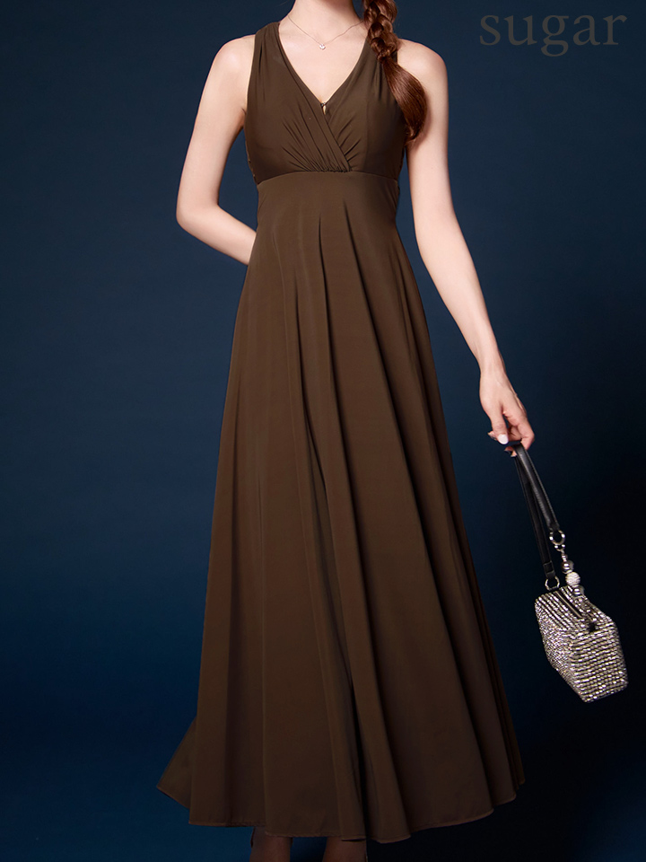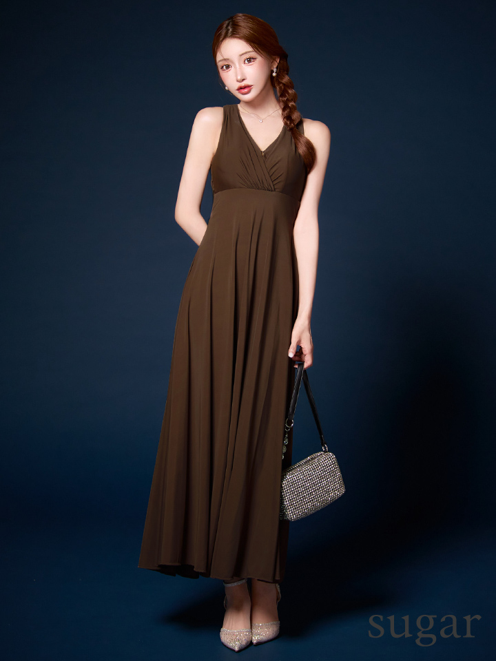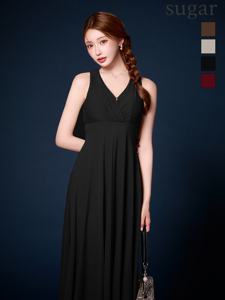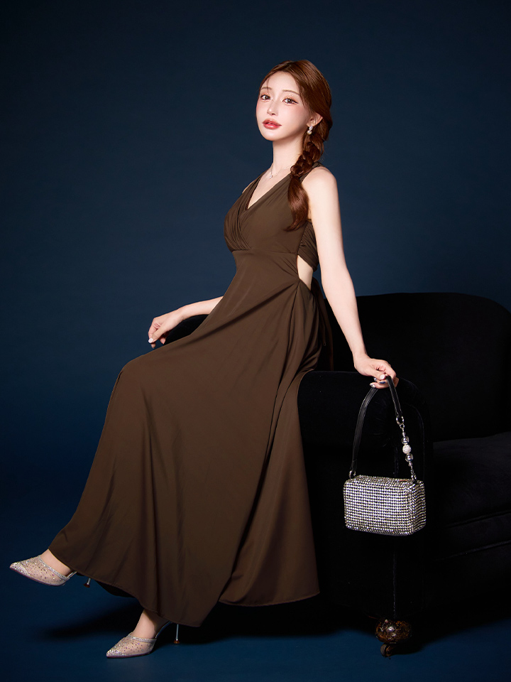 【予約商品/10月中旬-10月下旬発送予定】XSサイズあり【Veautt/ヴュート】【OF05】Vカット/ ウエストクロス/ バックオープン/ リボン/ フレア/ ロングドレス/ キャバドレス [VT022525-GY-S251023]