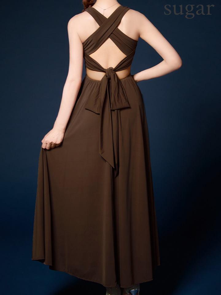 クロスバックとリボン結びが、後ろ姿に印象的なアクセントをプラス。