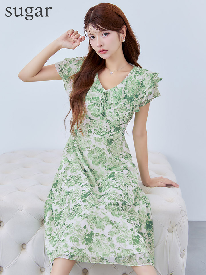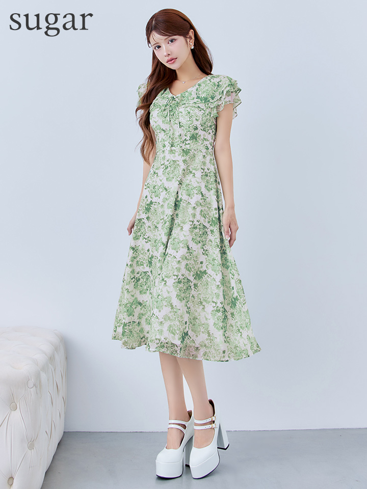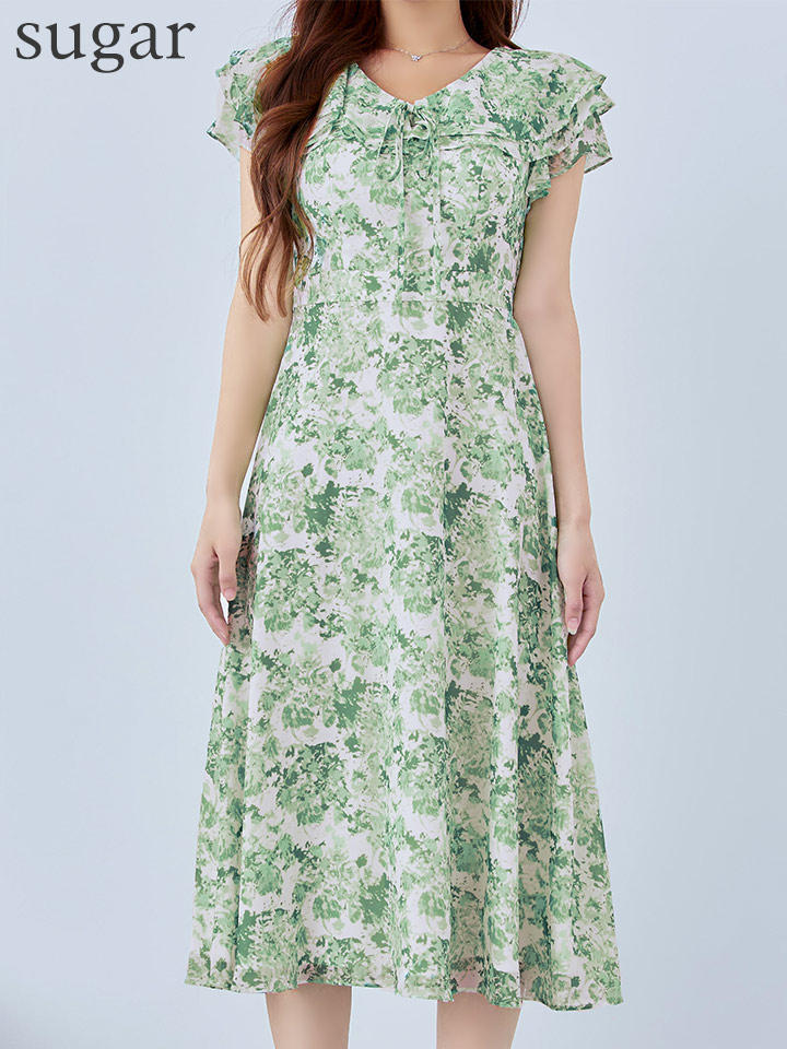 リーフ柄の様なプリントとシフォンの透け感が爽やかなミディアムドレス♡