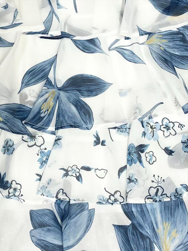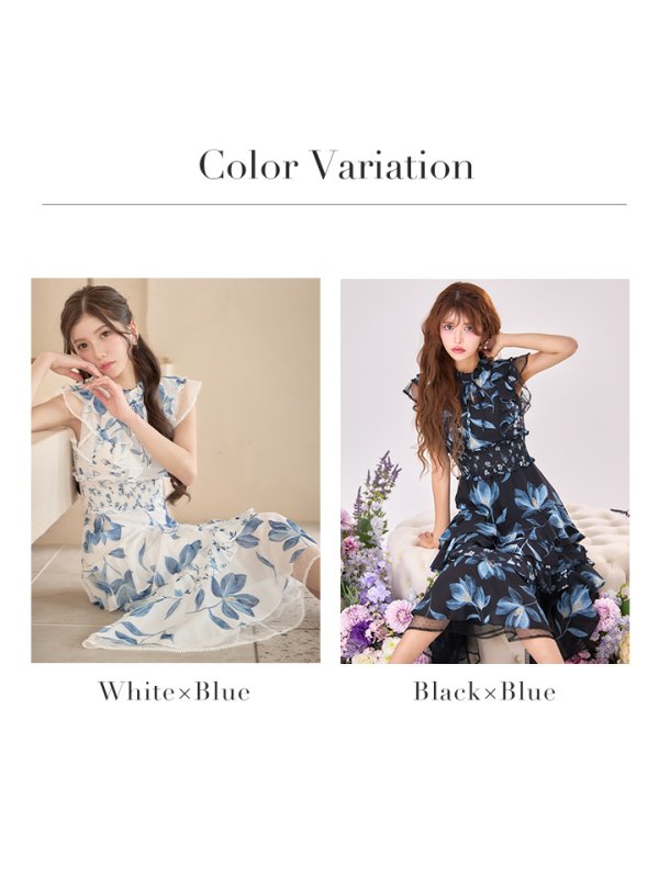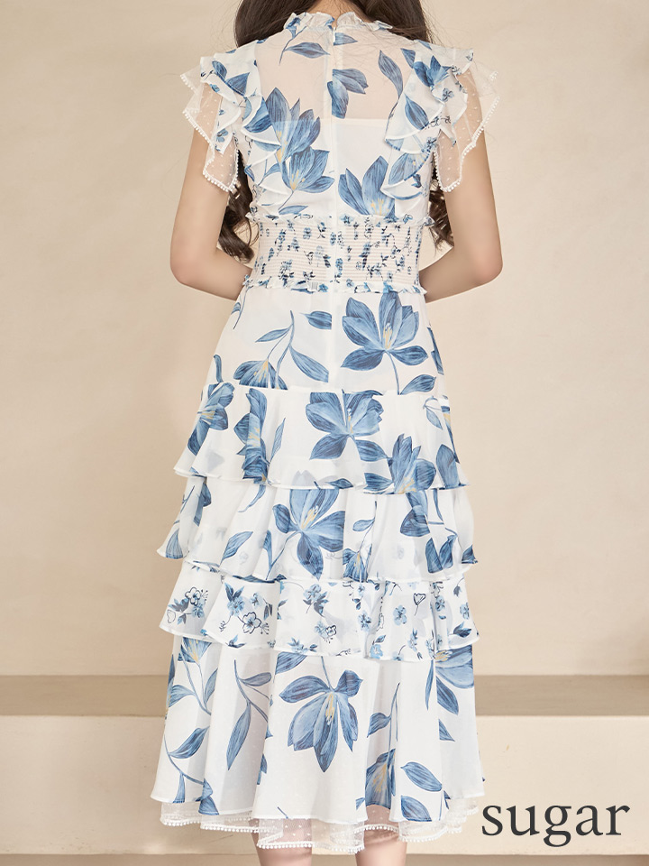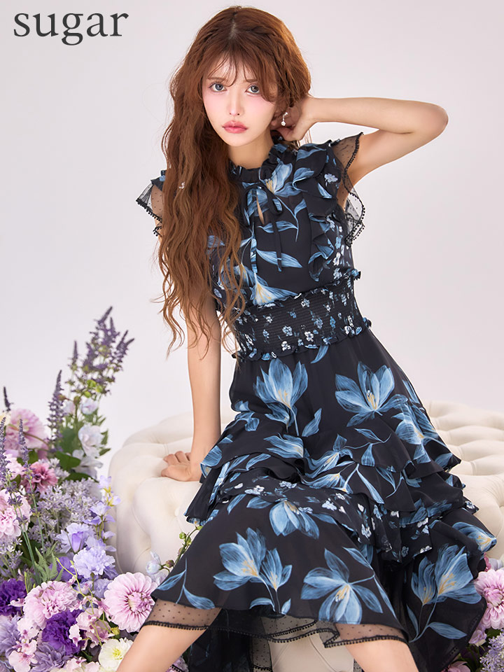 XS-Lサイズあり【SETTAN/セッタン】フラワープリント/ ティアード/ フリルスリーブ/ Aライン/ シフォン/ ワンピース/ ミディアムドレス/ キャバドレス[OF2] [LKS91208-BxBL-S2510]