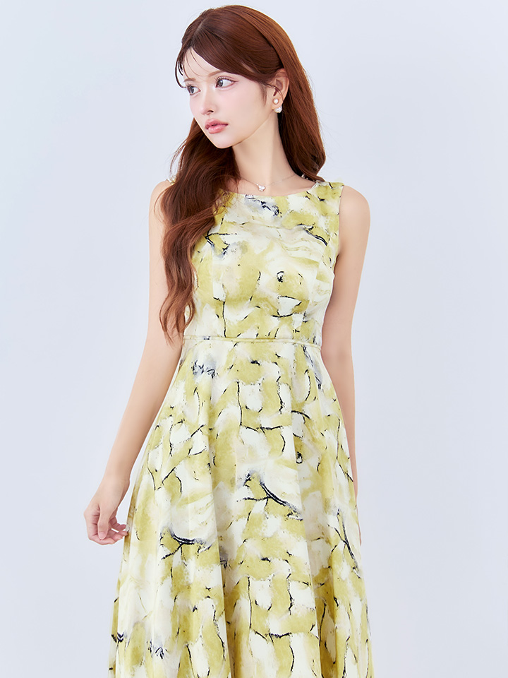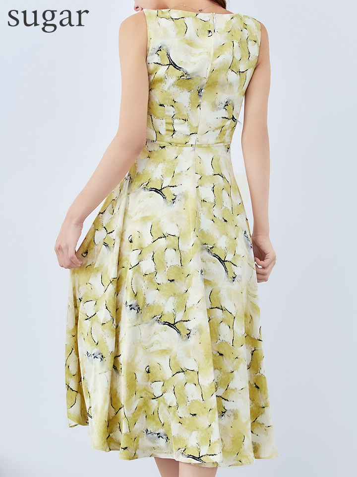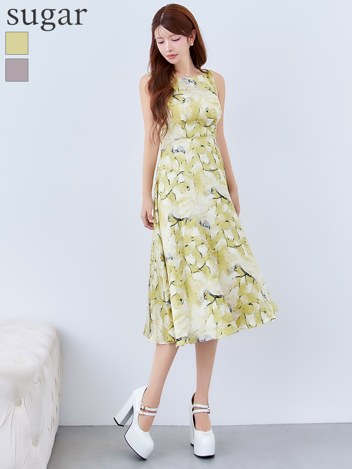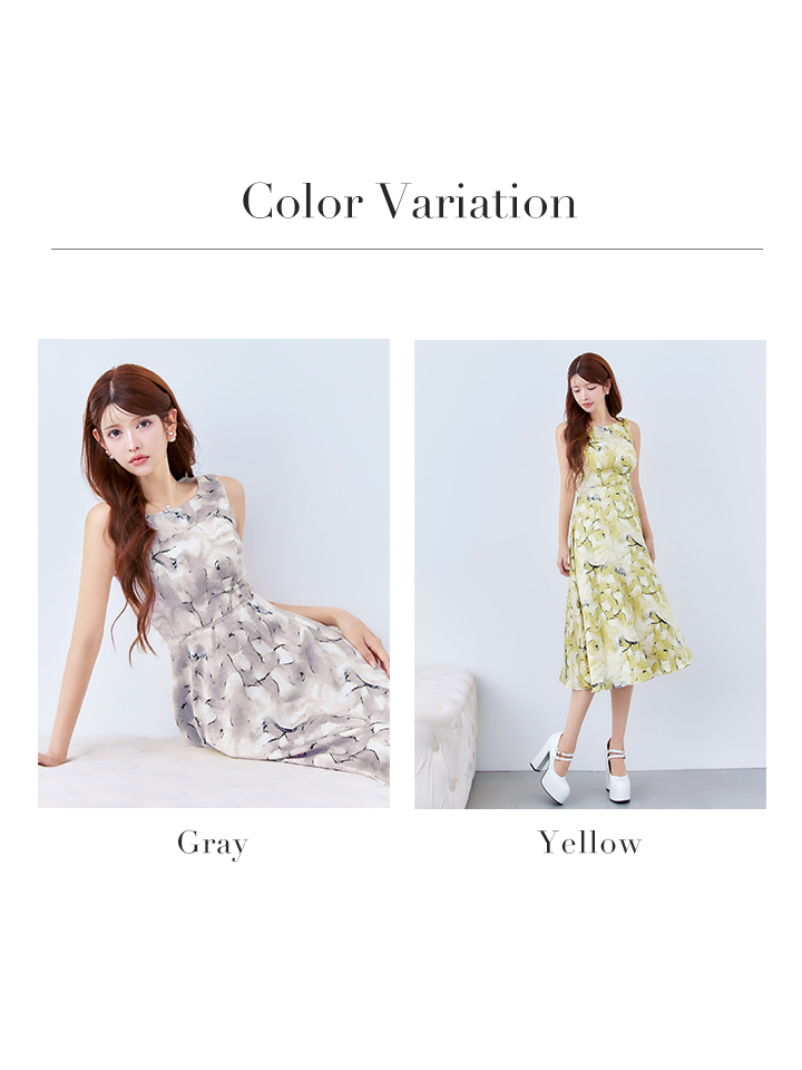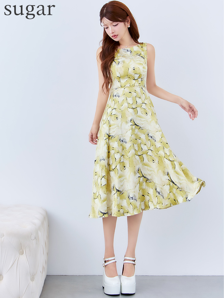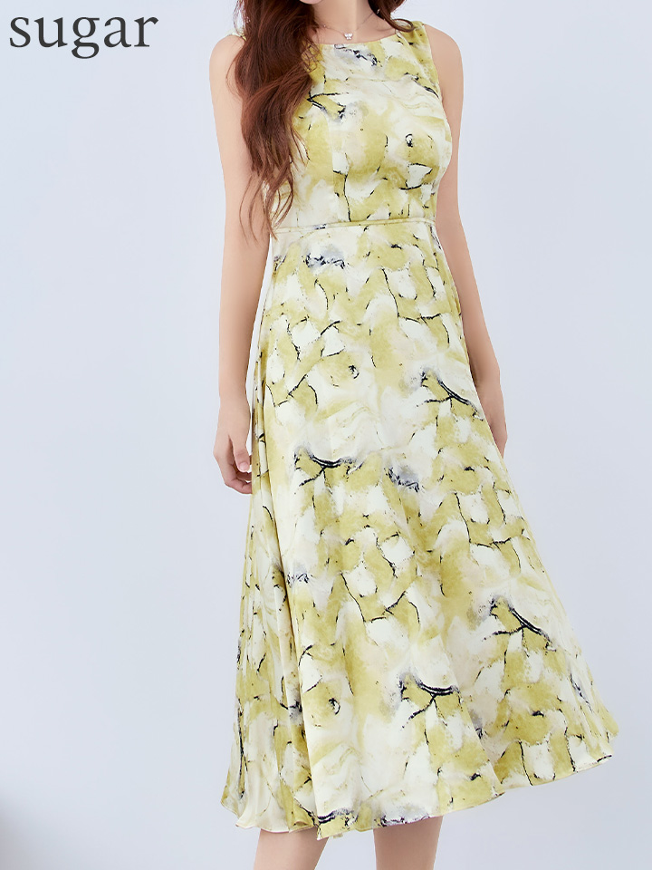 XS-Lサイズあり【GINZA COUTURE/銀座クチュール】ボートネック/ プリント/ サテン/ ノースリーブ/ Aライン/ 膝丈/ フレア/ ミディアムドレス/ キャバドレス[OF2] [LKC36215-GY-S2510]
