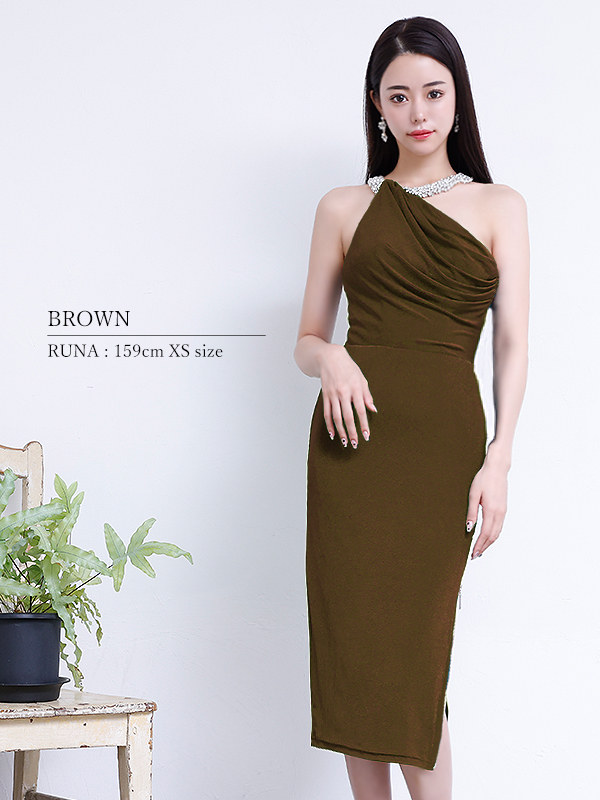 XSサイズあり【Veautt/ヴュート】【OF05】ネックビジュー/ ドレープ/ ファスナー/ スリット/ タイト/ ミディアムドレス/ キャバドレス【一部予約商品/10月中旬-10月下旬発送予定】 [VT11232-BR-2510]