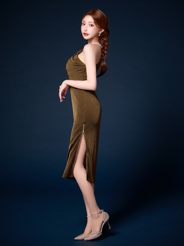 XSサイズあり【Veautt/ヴュート】【OF05】ネックビジュー/ ドレープ/ ファスナー/ スリット/ タイト/ ミディアムドレス/ キャバドレス【一部予約商品/10月中旬-10月下旬発送予定】 [VT11232-BR-S251023]