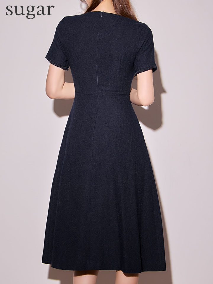 XS-Lサイズあり【GINZA COUTURE/銀座クチュール】シンプル/ ビジュー/ パールボタン/ 半袖/ 袖あり/ 膝丈/ フレア/ ミディアムドレス/ キャバドレス[OF2] [LKC2862-Y-S251024]