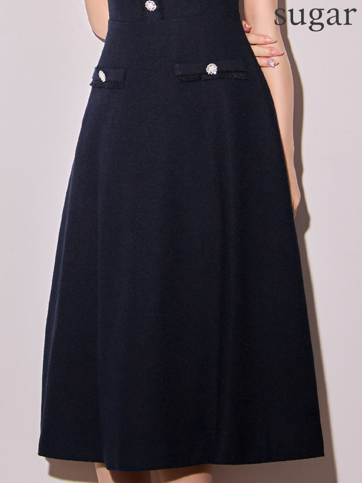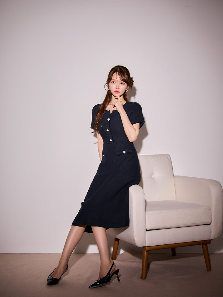 ビジューとパールボタンがさりげなく輝くミディアムワンピースドレス♡