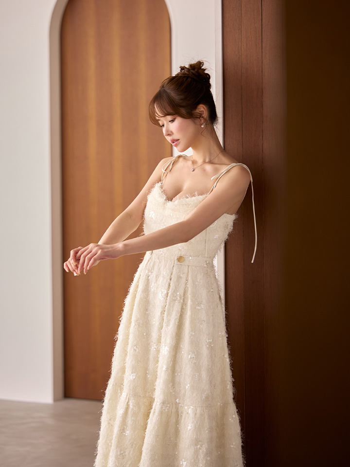 繊細なスパンコール付きエンブロイダリーレースを贅沢に使用したフレアワンピース。