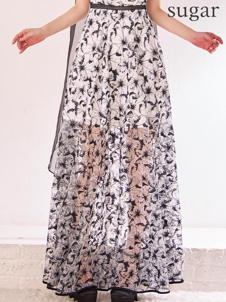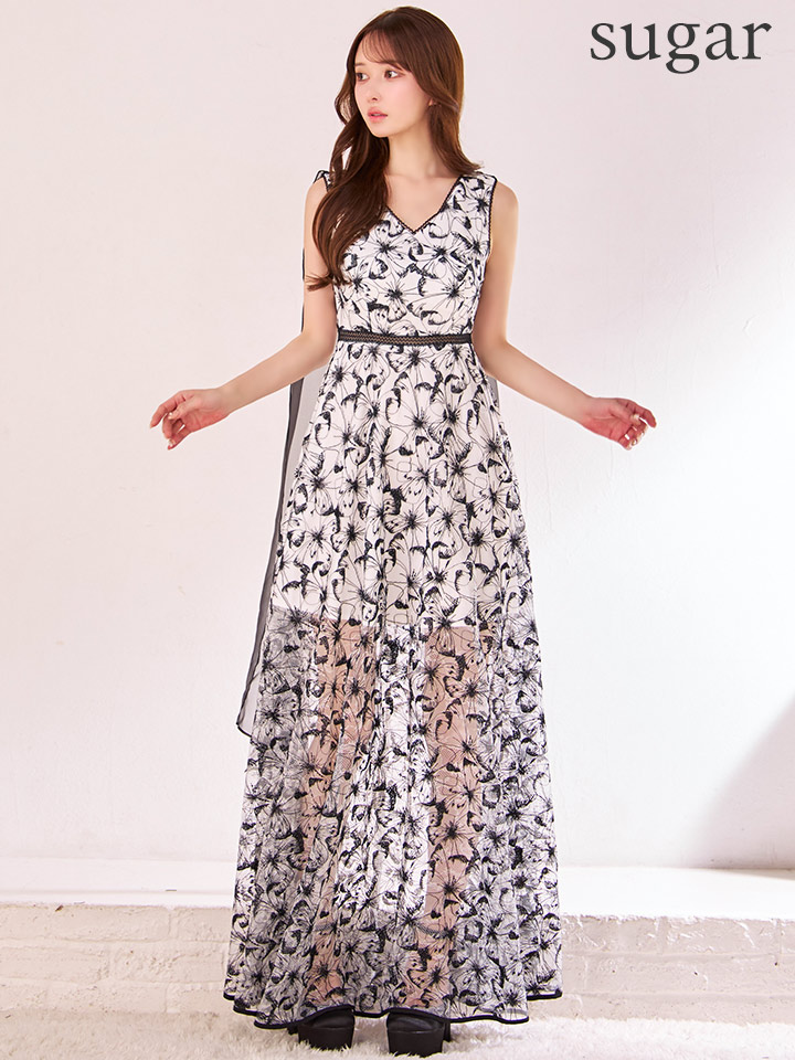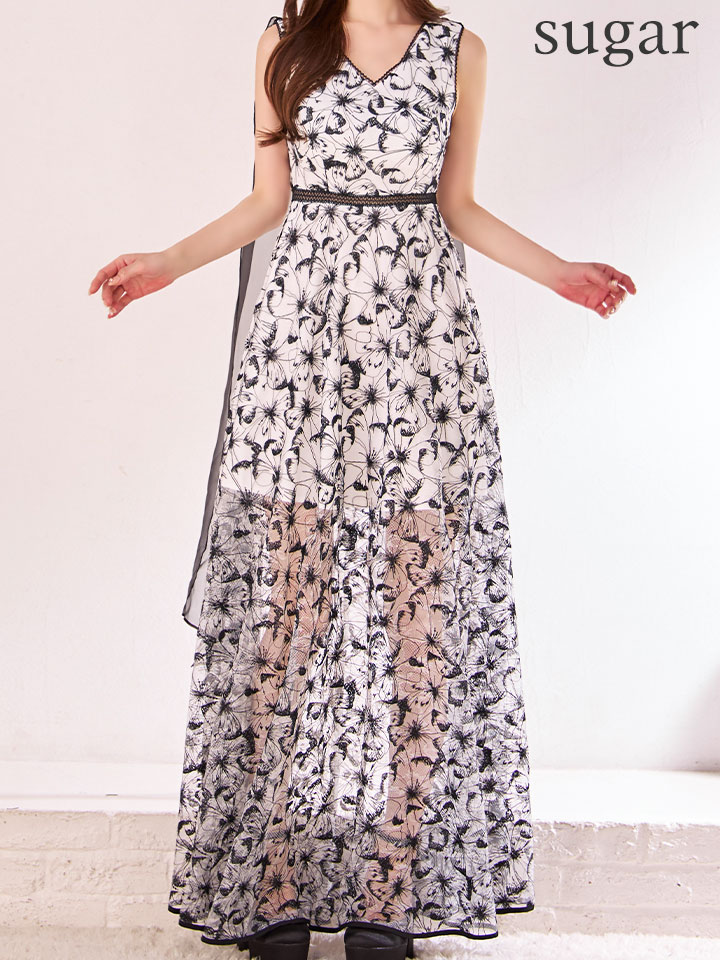 XS-Lサイズあり 【GINZA COUTURE/銀座クチュール】Vネック/ シースルー/ 花柄刺繍/ オーガンジー/ ノースリーブ/ フレア/ Aライン/ マキシ丈/ ワンピース/ ロングドレス/ キャバドレスlong[OF2] [LKC25153-WxB-S2510]