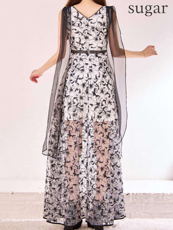 シースルー素材に花柄刺繍が軽やかな印象のフレアロングドレス♡