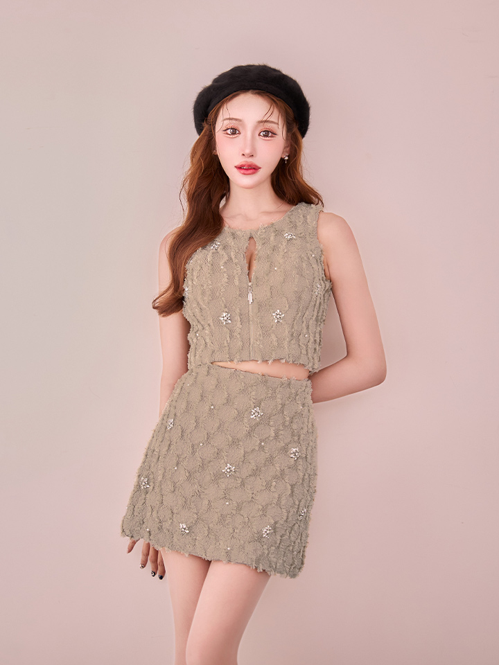 フリンジ付きの立体感ある生地が印象的なセットアップミニドレス♡