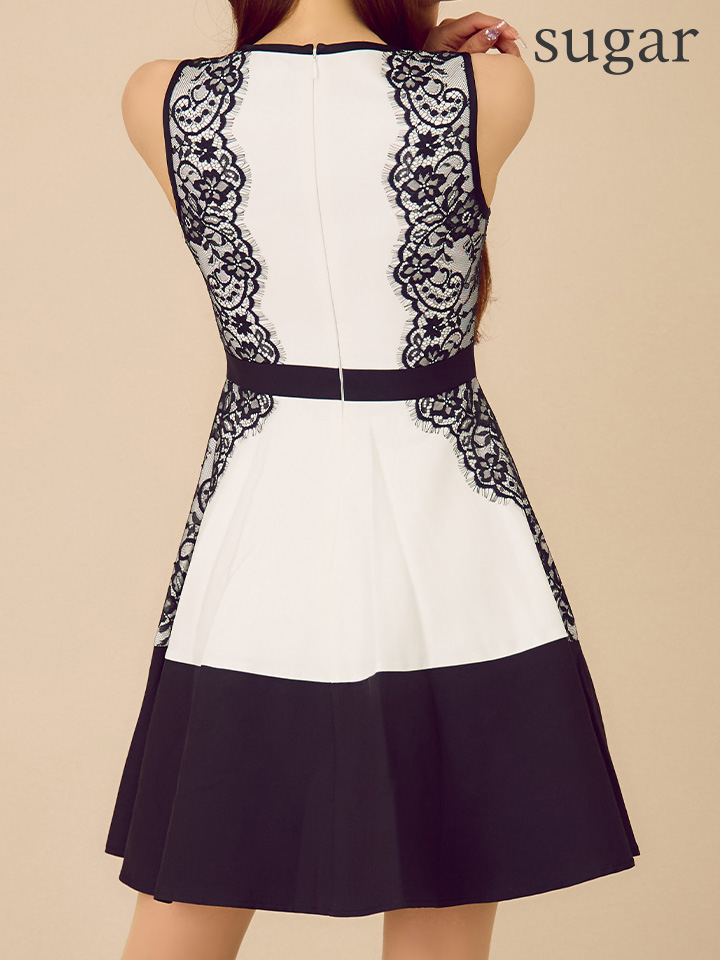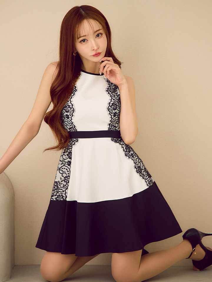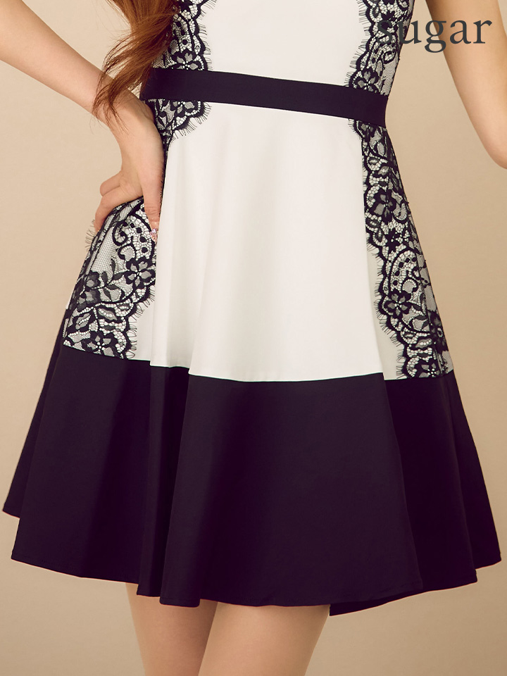 XS-Lサイズあり 【GINZA COUTURE/銀座クチュール】バイカラー/ ノースリーブ/ スカラップレース/ Aライン/ フレア/ ワンピース/ ミニドレス/ キャバドレス[OF2] [LKC25152-WxB-S2510]