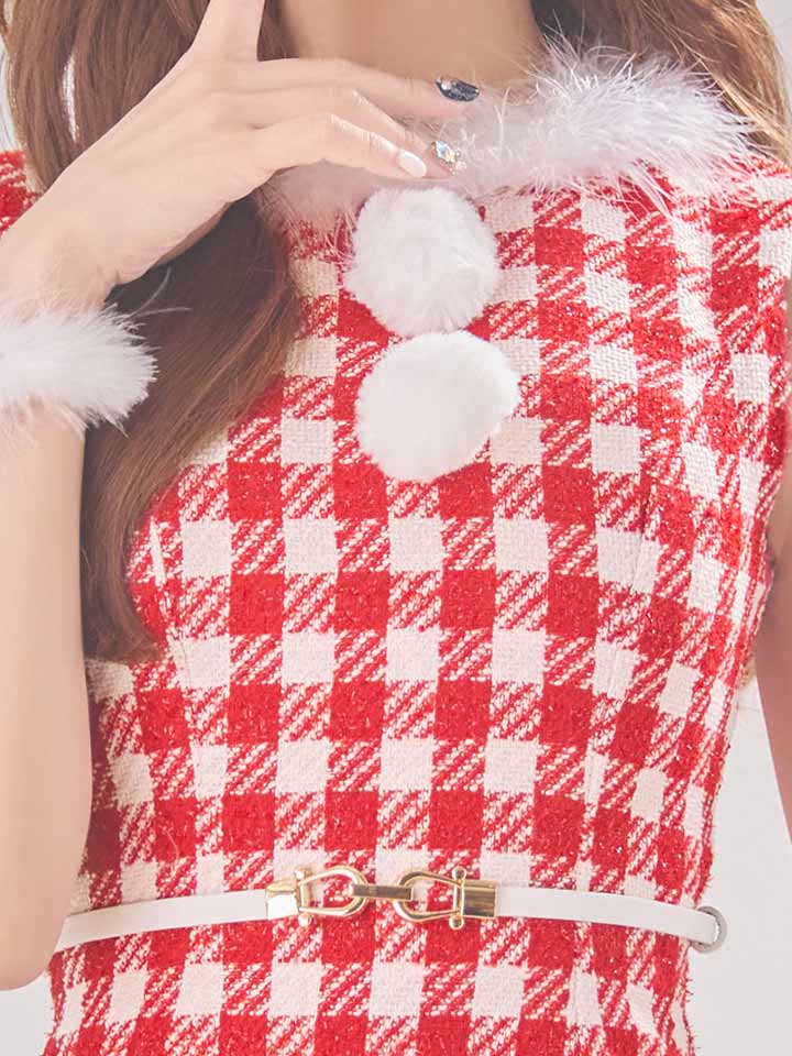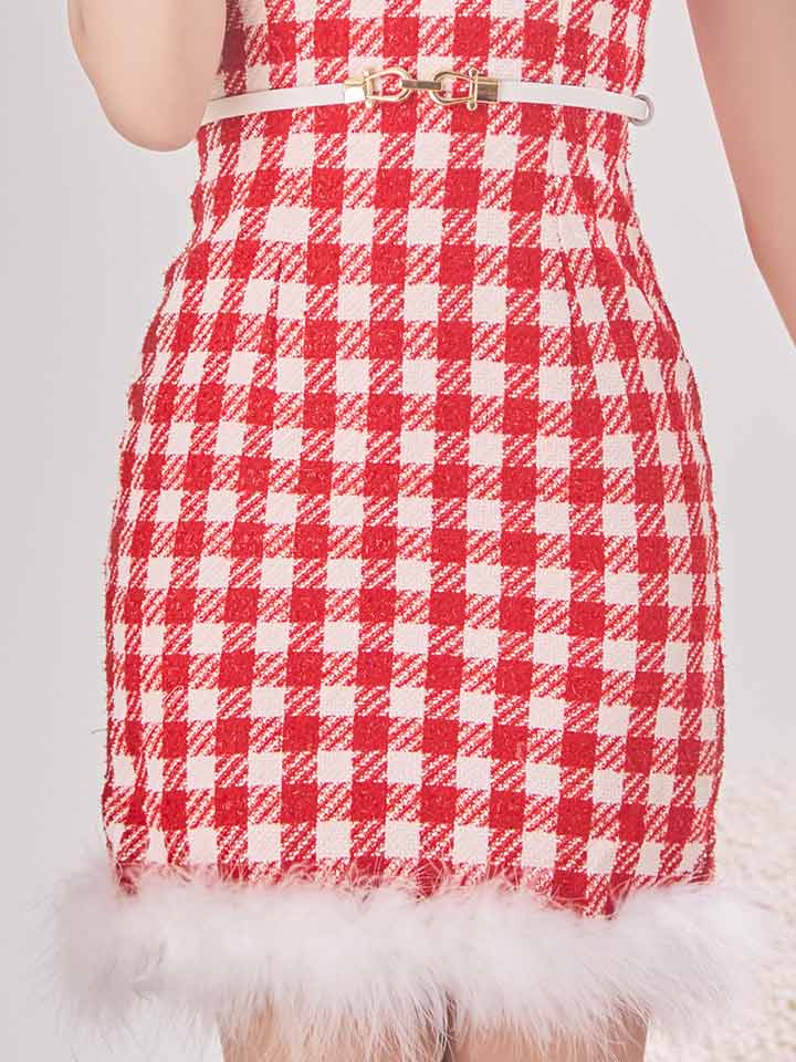 胸元隠し タイトスカート ファー ツイード チェック レッド ホワイト ミニ スカート