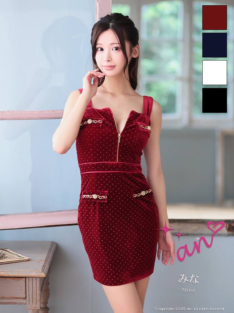 XSサイズあり【an /アン】ドットスタッズ/ ベロア/ ビジューボタン/ フロントジップ/ ノースリーブ/ ストレッチ/ タイト/ ミニドレス/ キャバドレス[OF05] [AOC4012-B-2510]