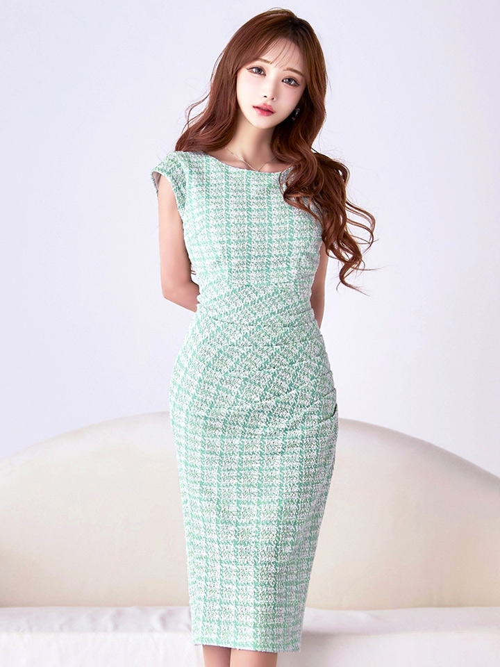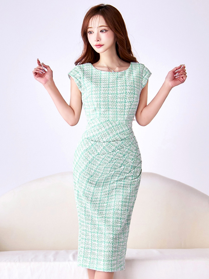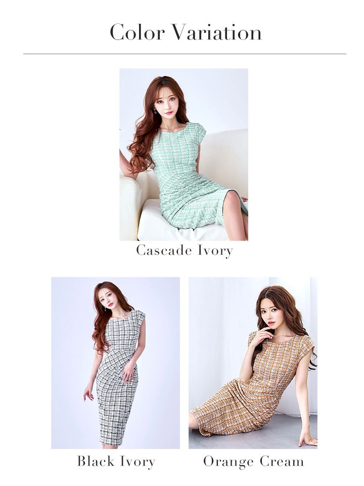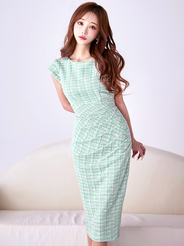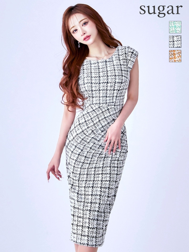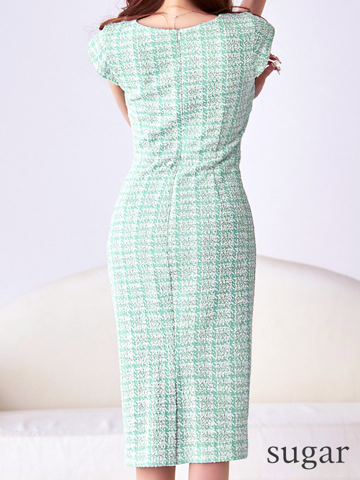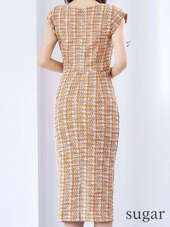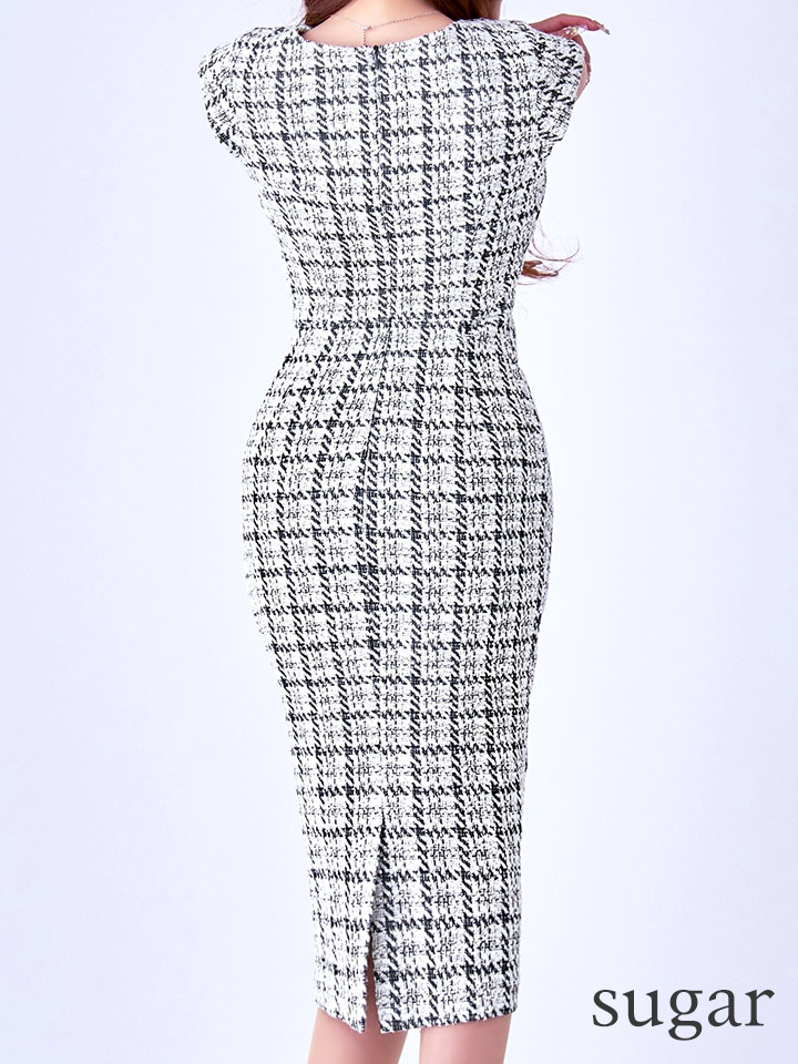 XLサイズあり【VANESSA HEART / ヴァネッサハート】【OF05】チェック柄/ ツイード/ フレンチスリーブ/ タック/ ストレッチ/ ひざ丈/ タイト/ ワンピース/ ミディアムドレス/ キャバドレス [H60214H-ORCM-S2510]