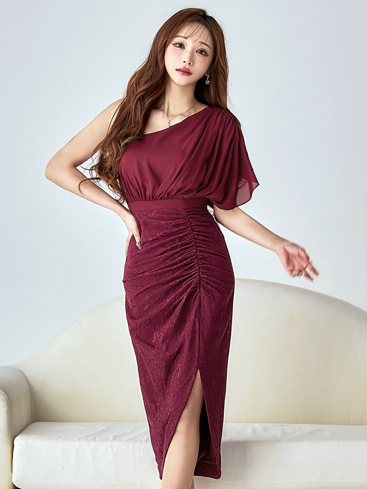 Lサイズあり【VANESSA HEART / ヴァネッサハート】【OF05】ワンショルダー/ シフォン/ 半袖/ 袖あり/ タック/ 切替/ タイト/ スリット/ ミディアムドレス/ キャバドレス [H60232H-BGD-S2510]