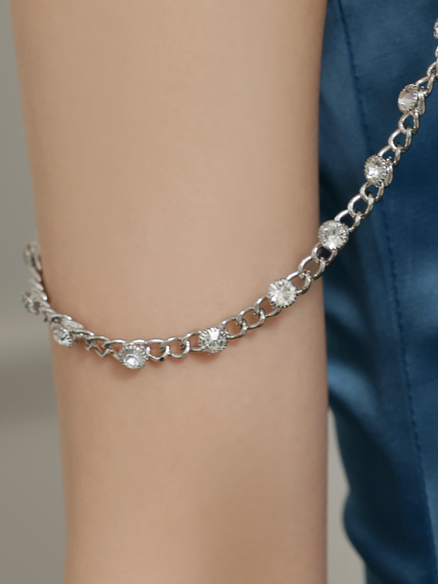 肩に流れるチェーンアクセが、エレガントな煌めきを添えます。