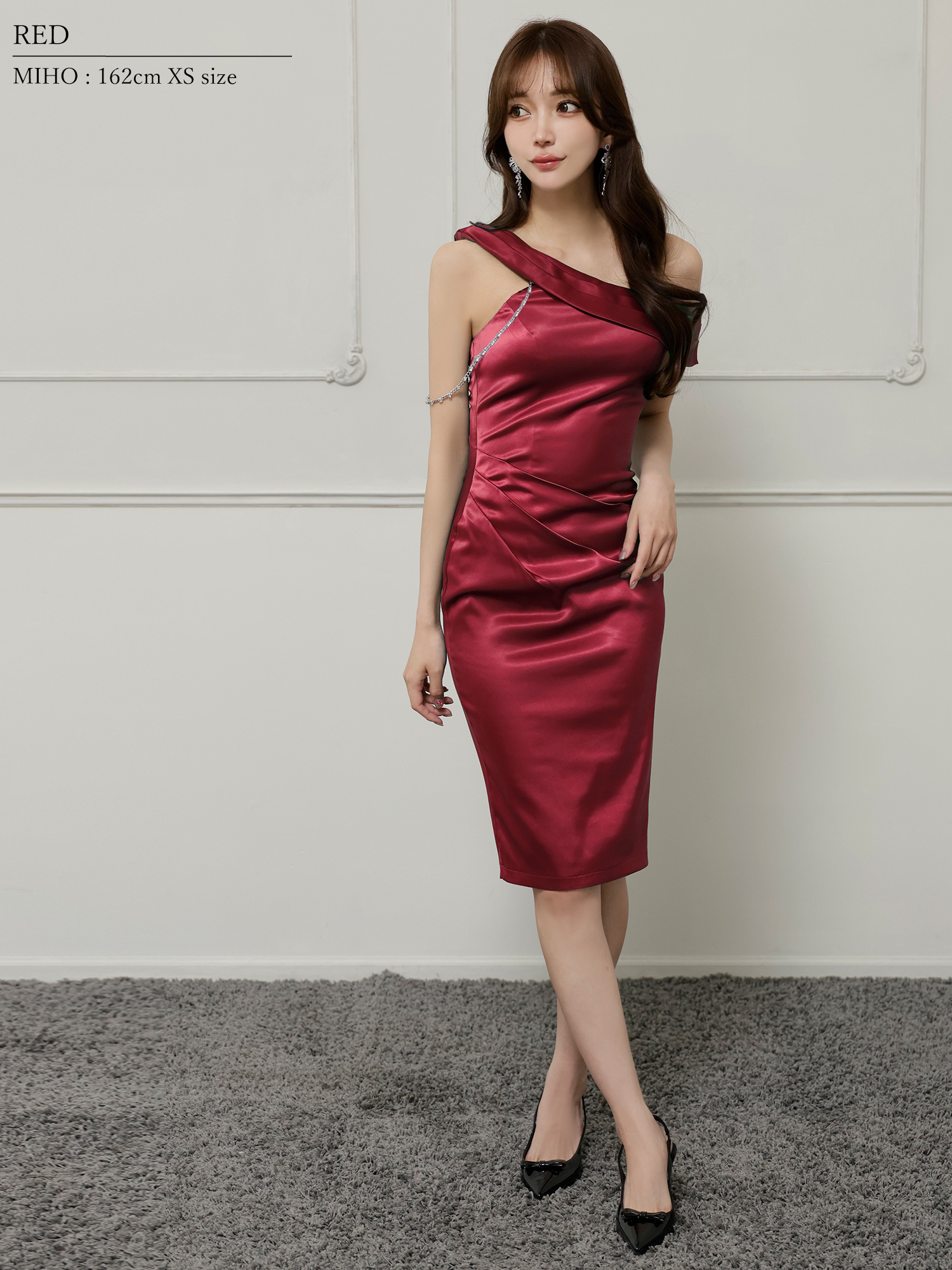 【予約商品/11月中旬-11月下旬発送予定】XSサイズあり【Veautt/ヴュート】【OF05】ワンショルダー/ ビジューチェーン/ サテン/ タイト/ ミディアムドレス/ キャバドレス [VT082525-R-2510]