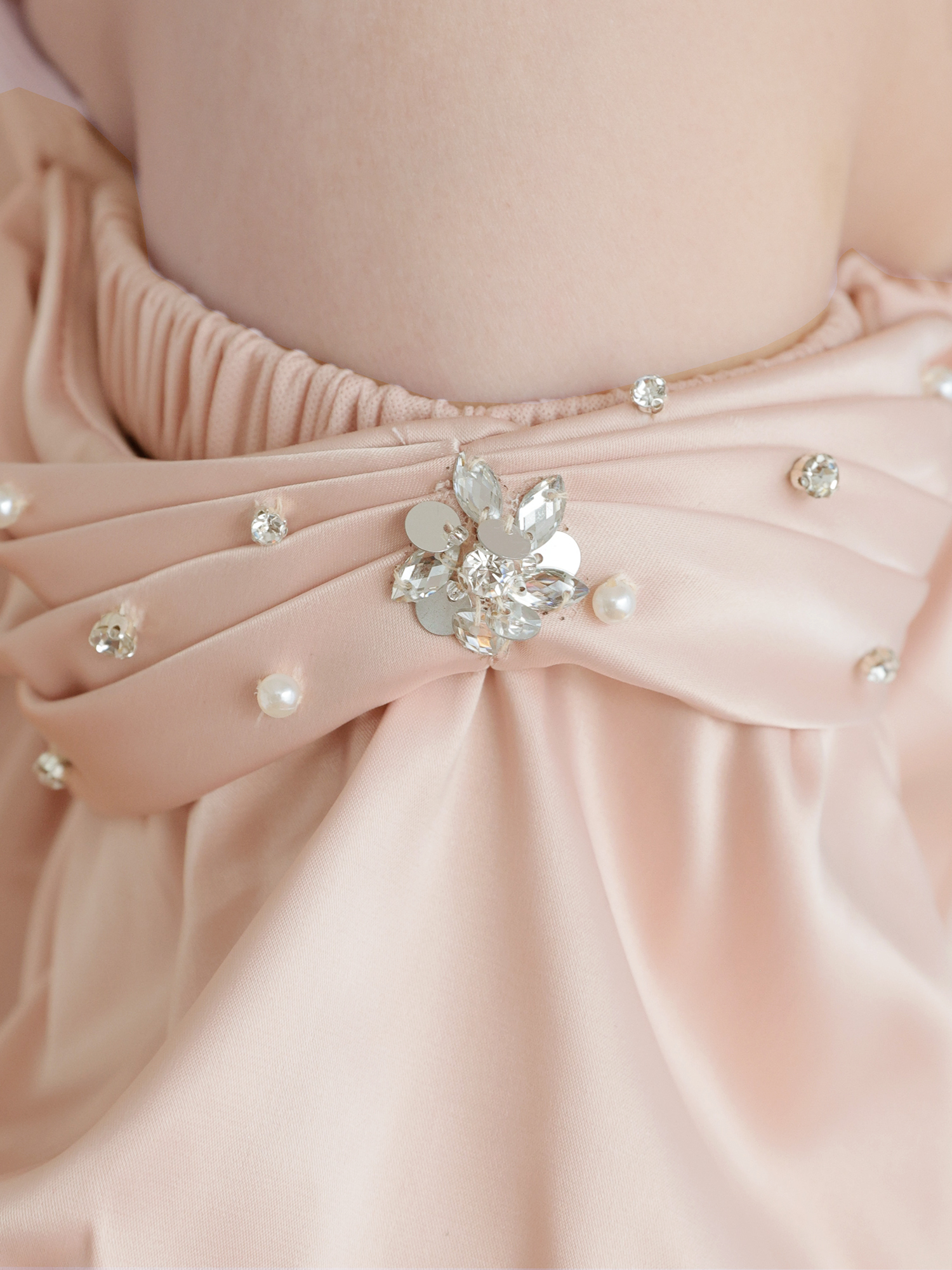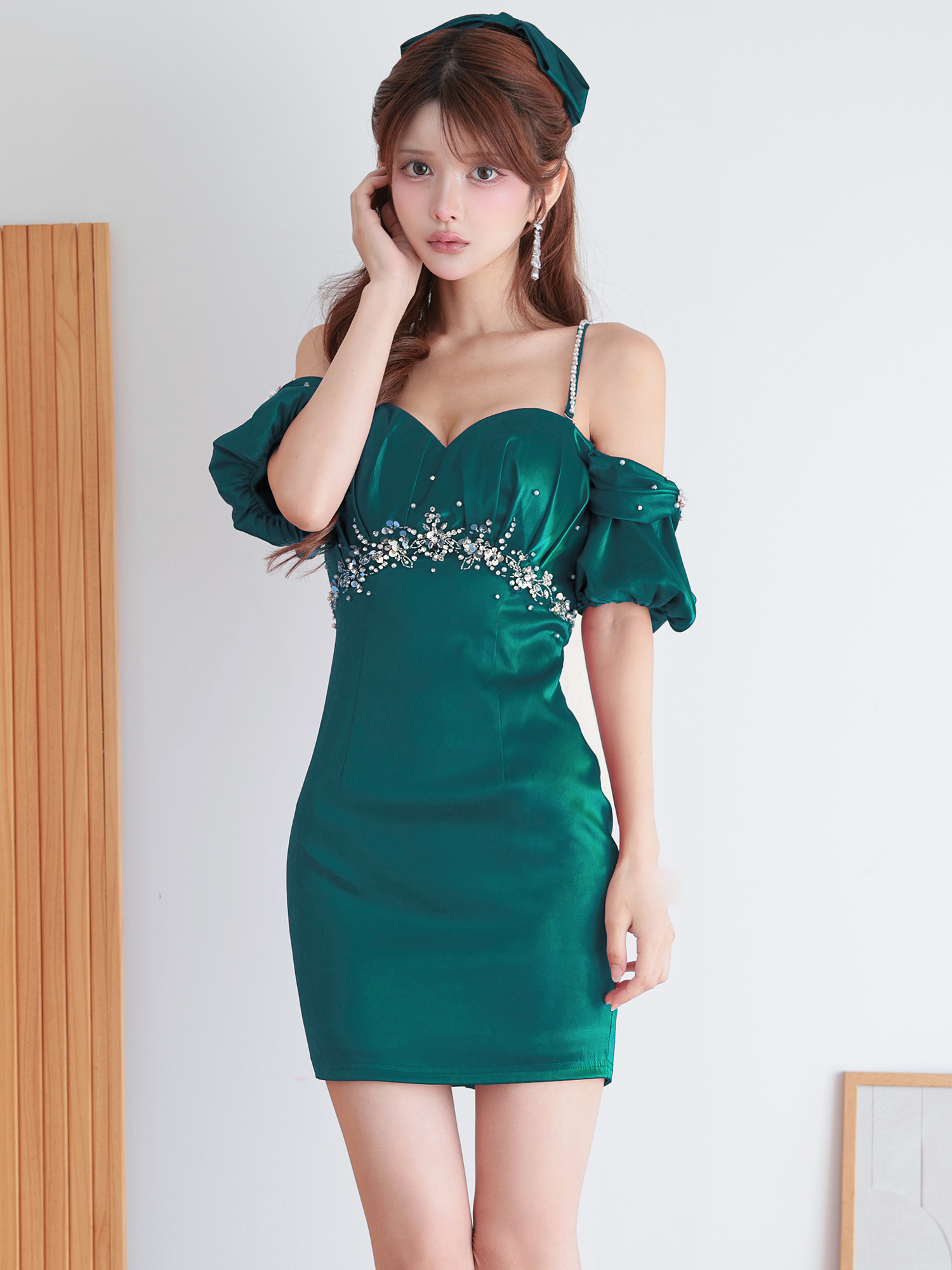 フリル袖とビジューの輝きが可愛さと艶っぽさを両立。