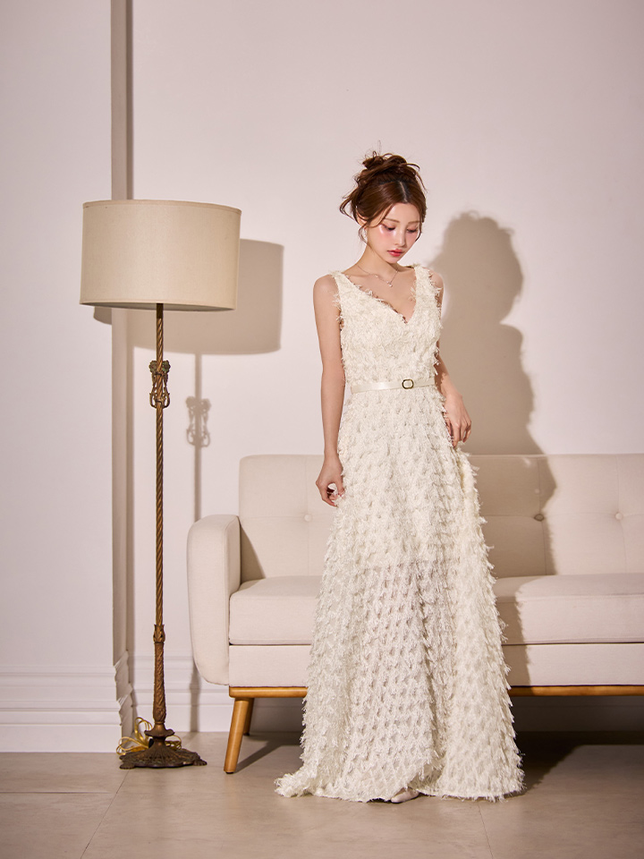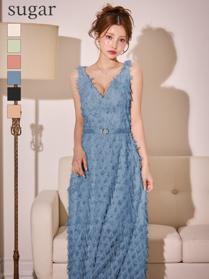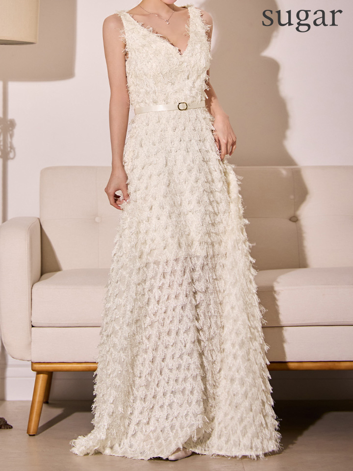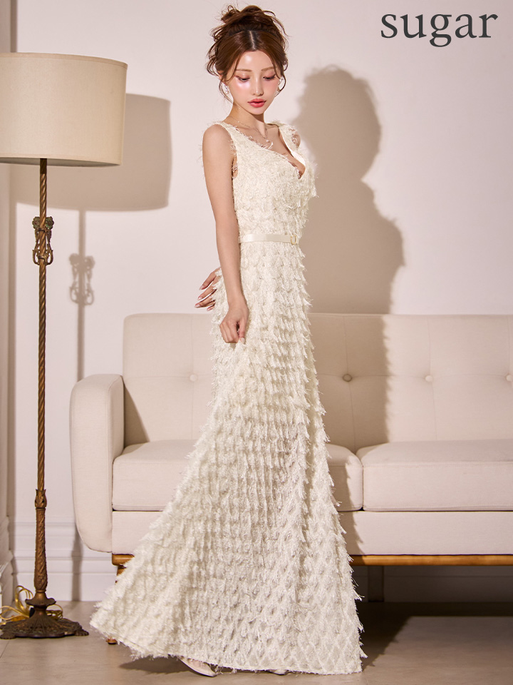 シャギーなフリンジが立体感ある表情のフレアロングドレス♡