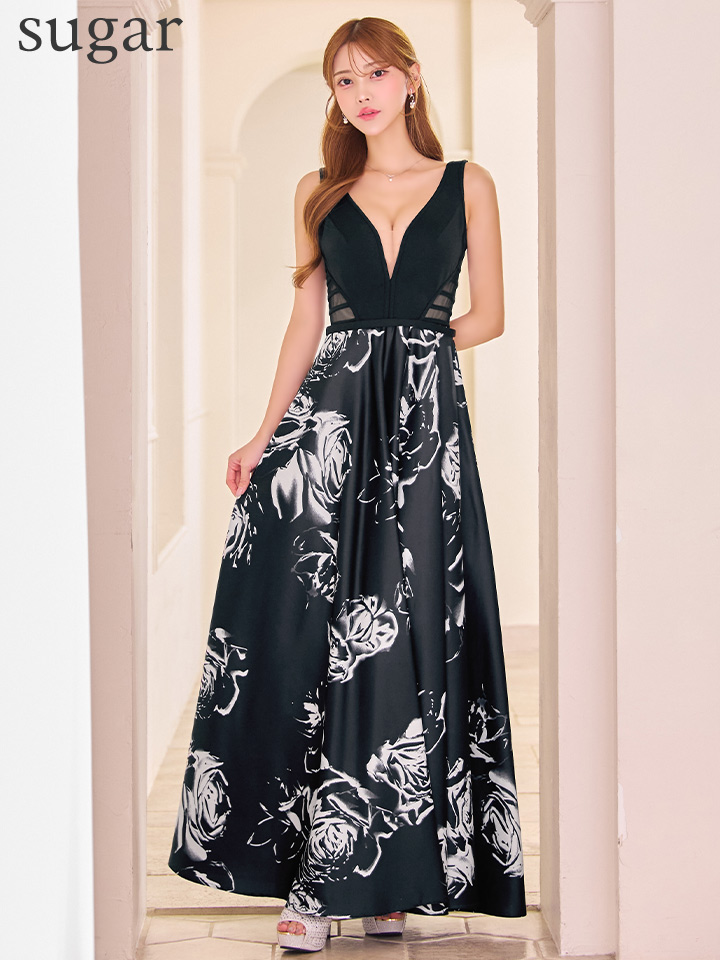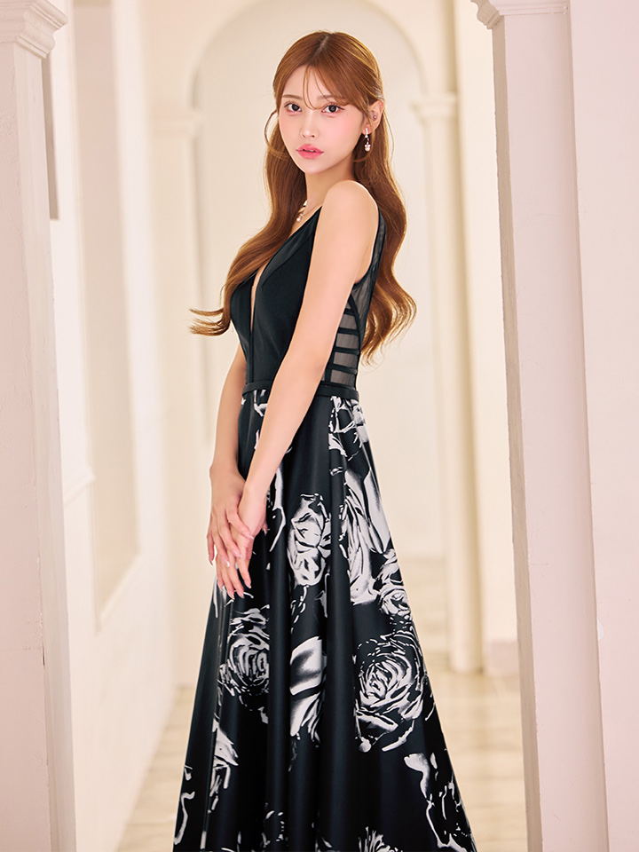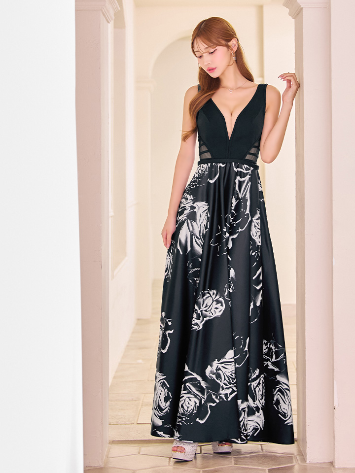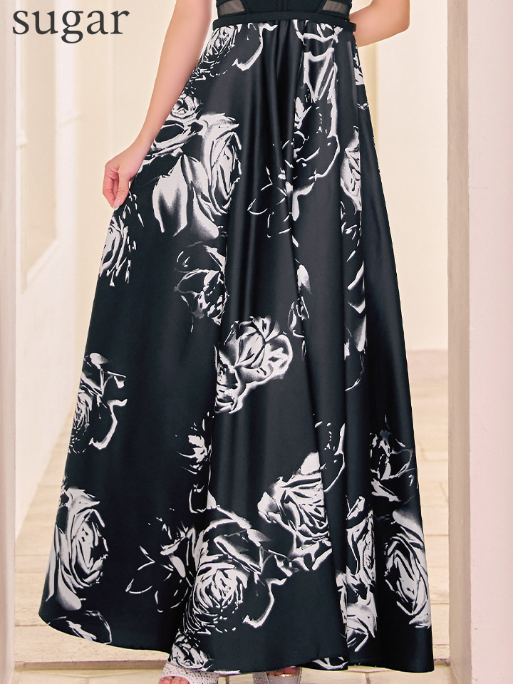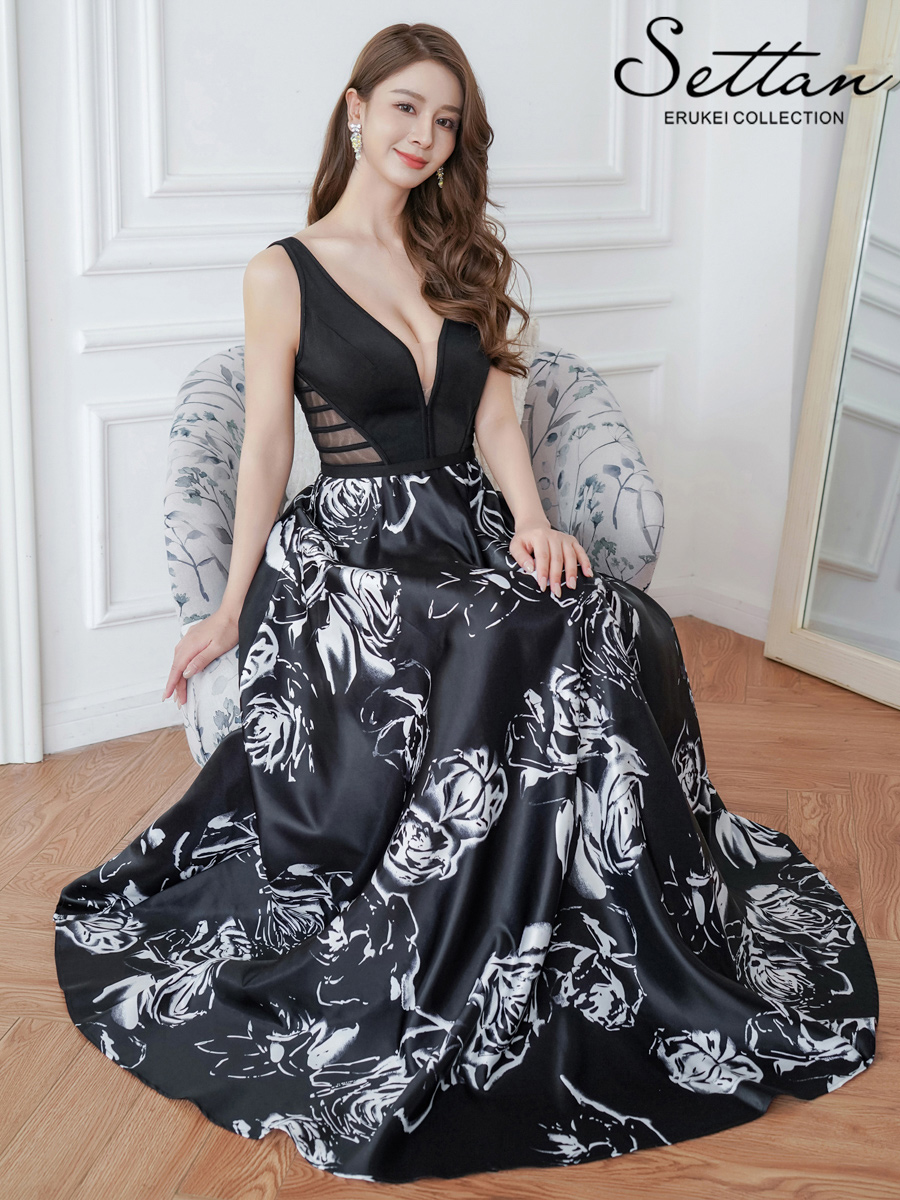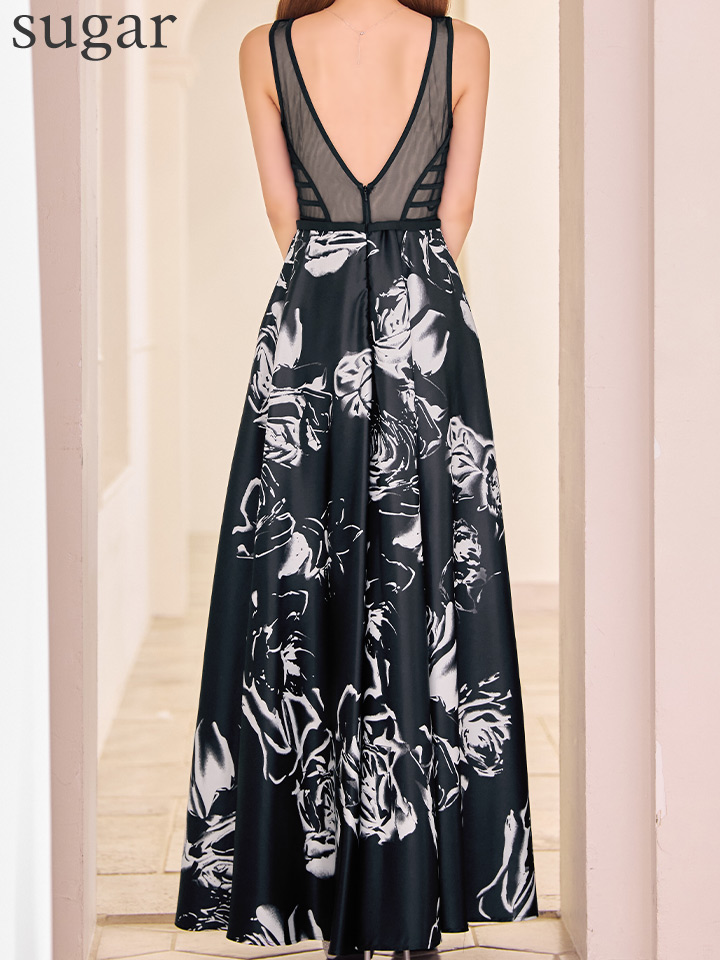 XS-Lサイズあり【SETTAN/セッタン】フラワープリント/ 花柄/ ノースリーブ/ フレア/ Aライン/ ロングドレス / サテン / シースルー / キャバドレス long[OF2] [LKS36509-BxW-S2511]