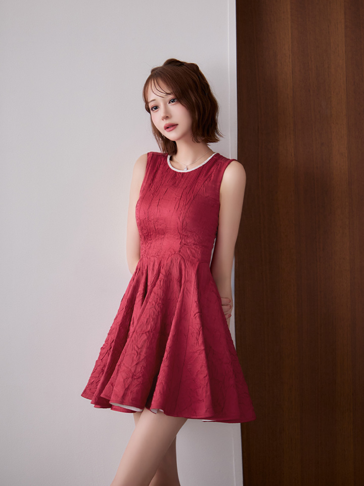 しわ加工が施された光沢生地が上品で印象的なフレアミニドレス♡
