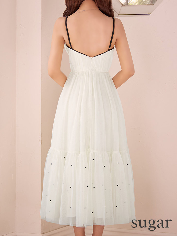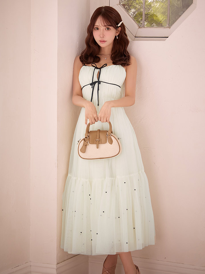 全体に施されたドットパールと、胸元を飾るブラックリボンがアクセントに。