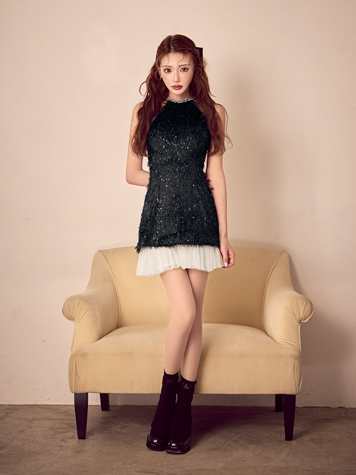 スパンコールが、照明を受けて眩い輝きを放つノースリーブミニドレス。