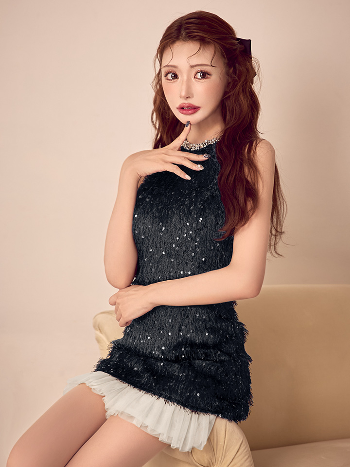 XSサイズあり【DEA./ディア】スパンコール/ フリンジ/ ハイネック/ フレア/ ミニドレス/ キャバドレス[OF08] [DE4135-B-S251119]