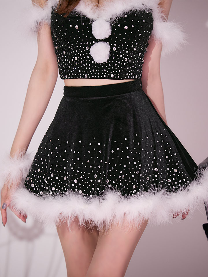 ブラック 黒 スカート ミニスカート フレアスカート 胸盛り 肩出し ファー