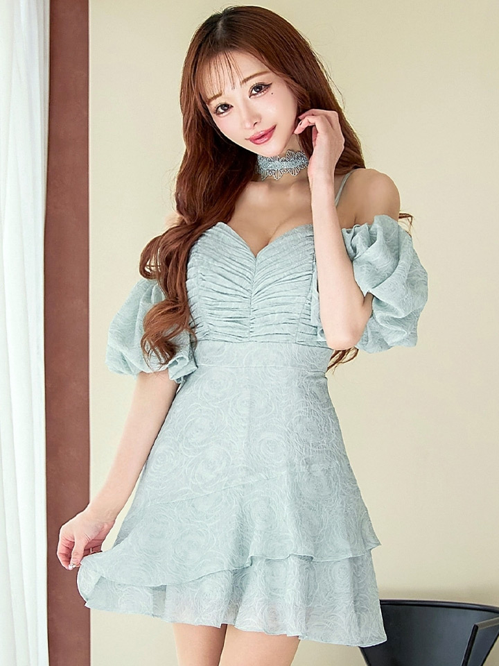 XS-Lサイズあり【Donia Quinn / ドニアクイーン】 オフショル/ リップル生地/ 花柄/ チョーカー付き/ バストギャザー/ フレア/ ミニドレス/ キャバドレス[OF05] [Q60236Y-BL-S2511]