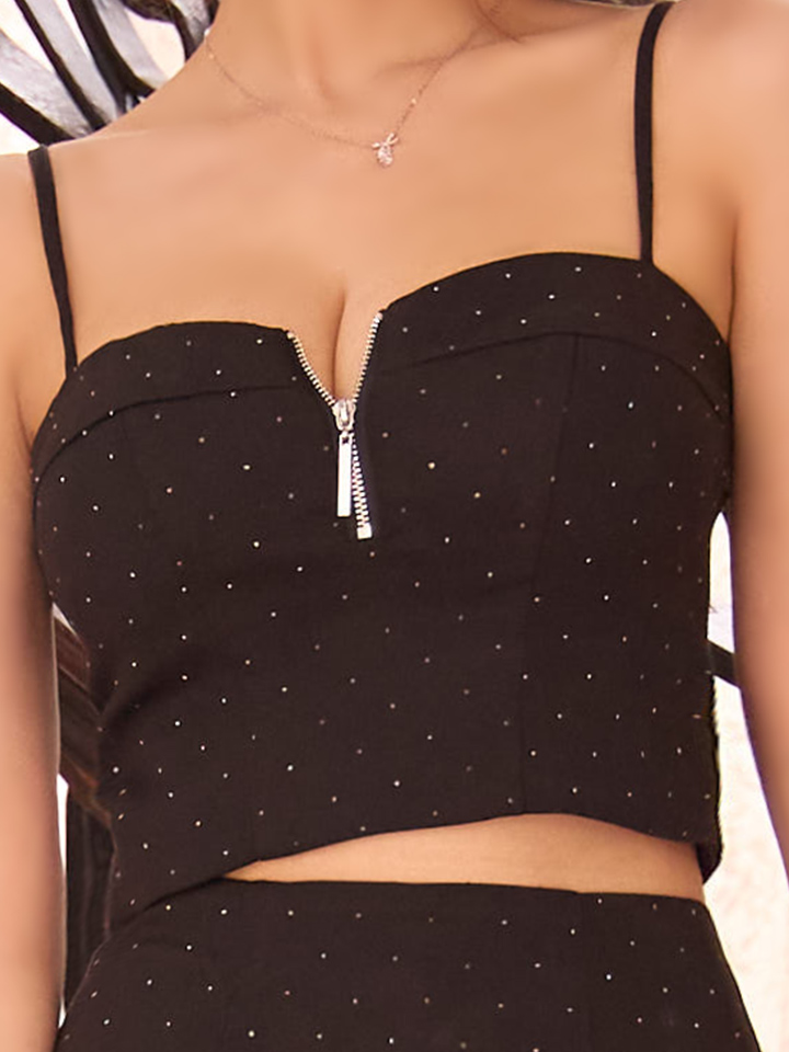 全面に煌めくストーンが散りばめられた、ラグジュアリーなベアトップセットアップ。
