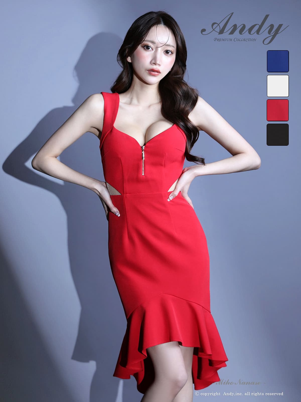 【ANDY/アンディ】フロントジップ/ ウエストカット/ フリル/ タイト/ ミディアムドレス/ キャバドレス[OF05] [ON3029-R-2511]
