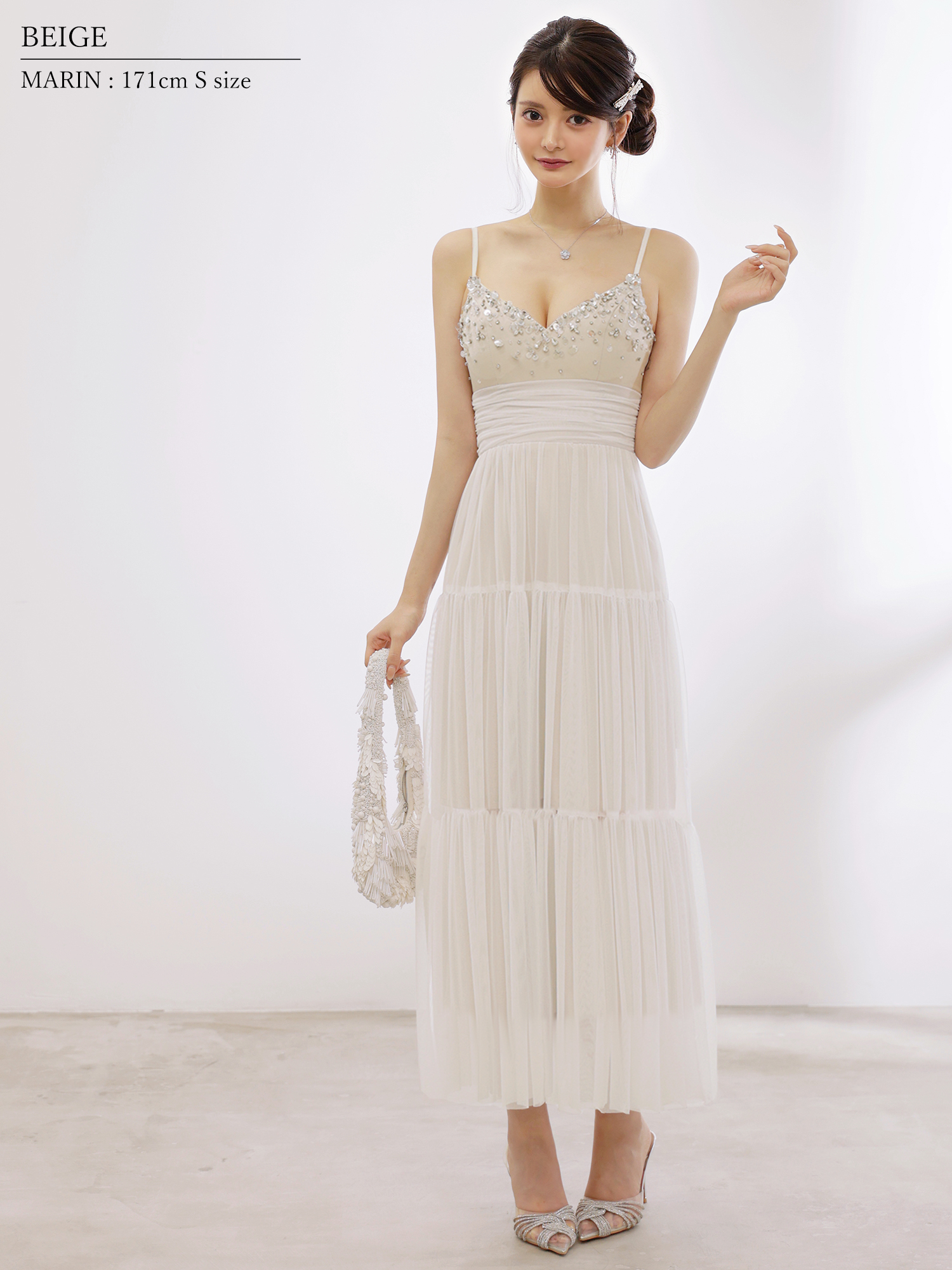 tier(ティアード)風に重ねたチュールスカートが軽やかに広がり、ドレス全体のラグジュアリー感を高める。