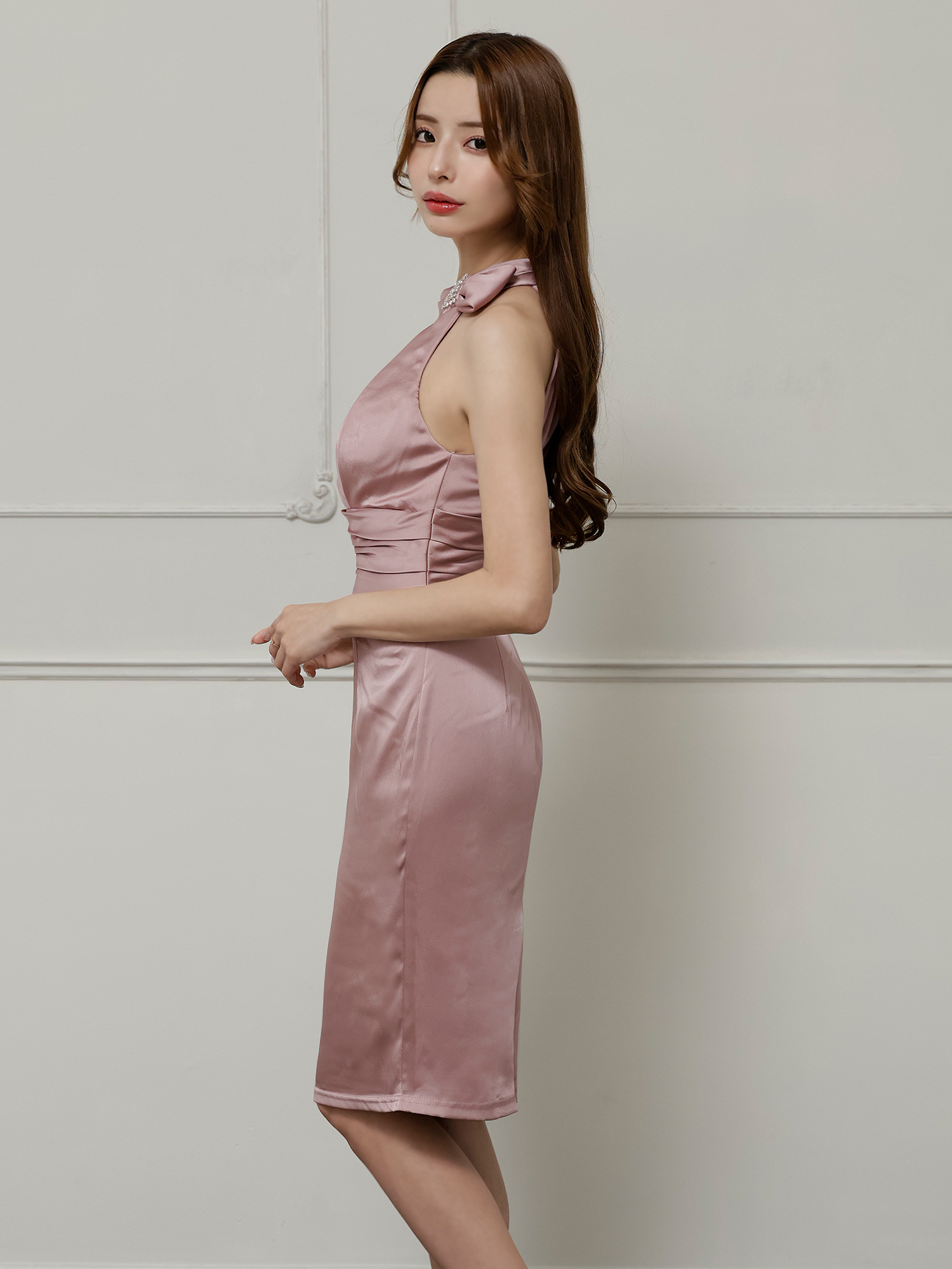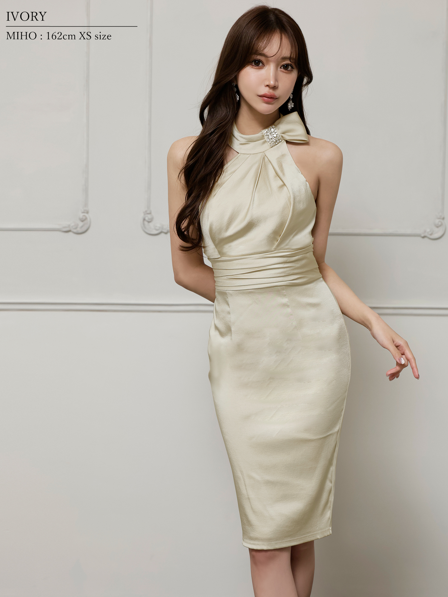 XSサイズあり【Veautt/ヴュート】【OF05】ホルターネック/ ウエストマーク/ ドレープ/ ビジュー/ タイト/ ミディアムドレス/ キャバドレス [VT022524-B-S251127]