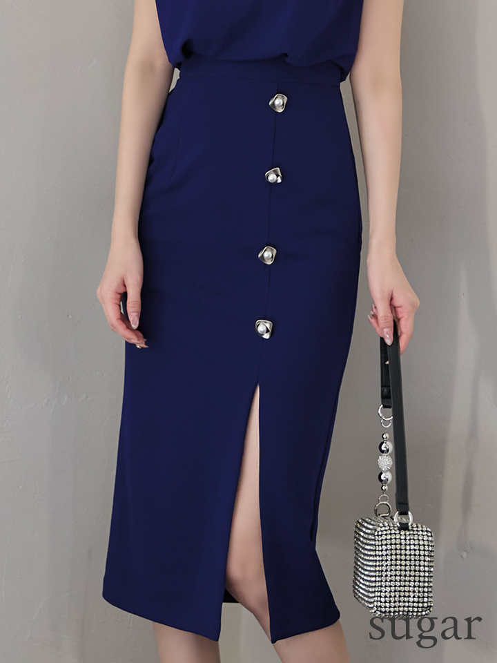 サイドのボタンとスリットがアクセントになり、上品さの中に女性らしさを添えます。