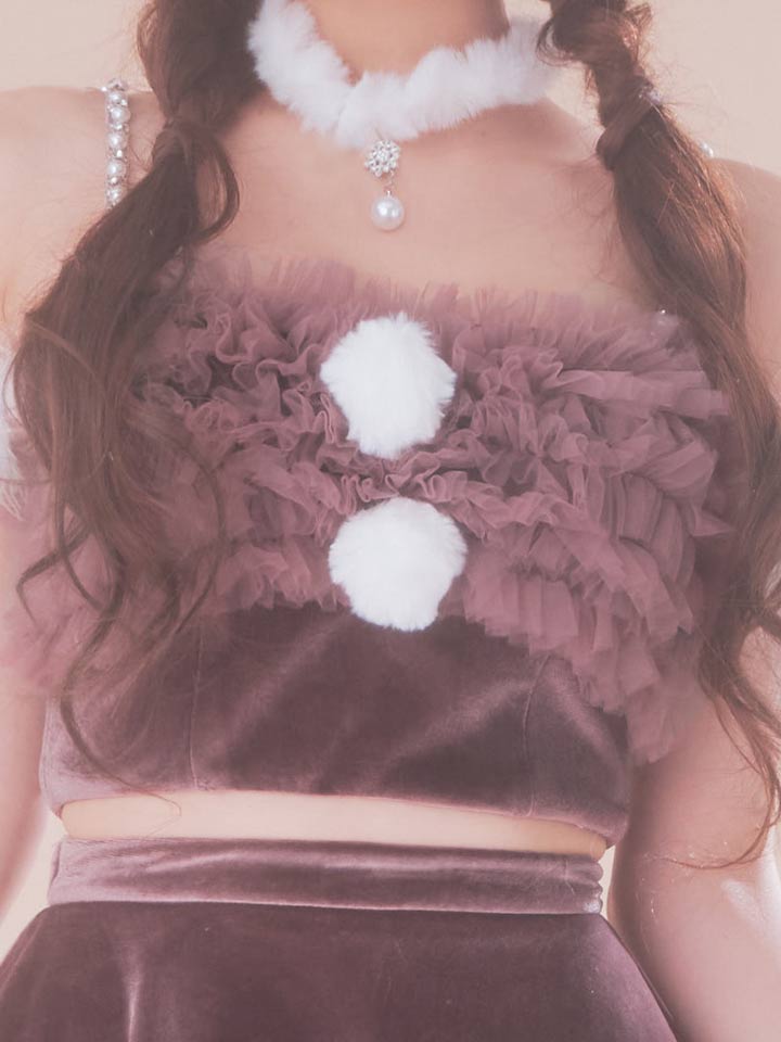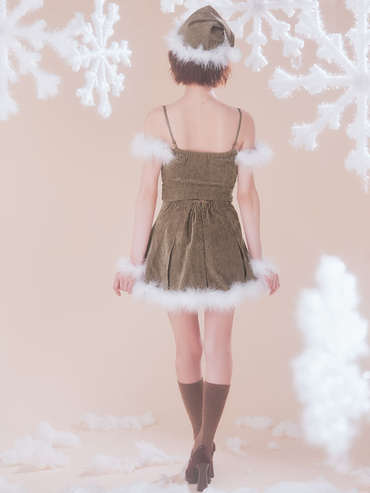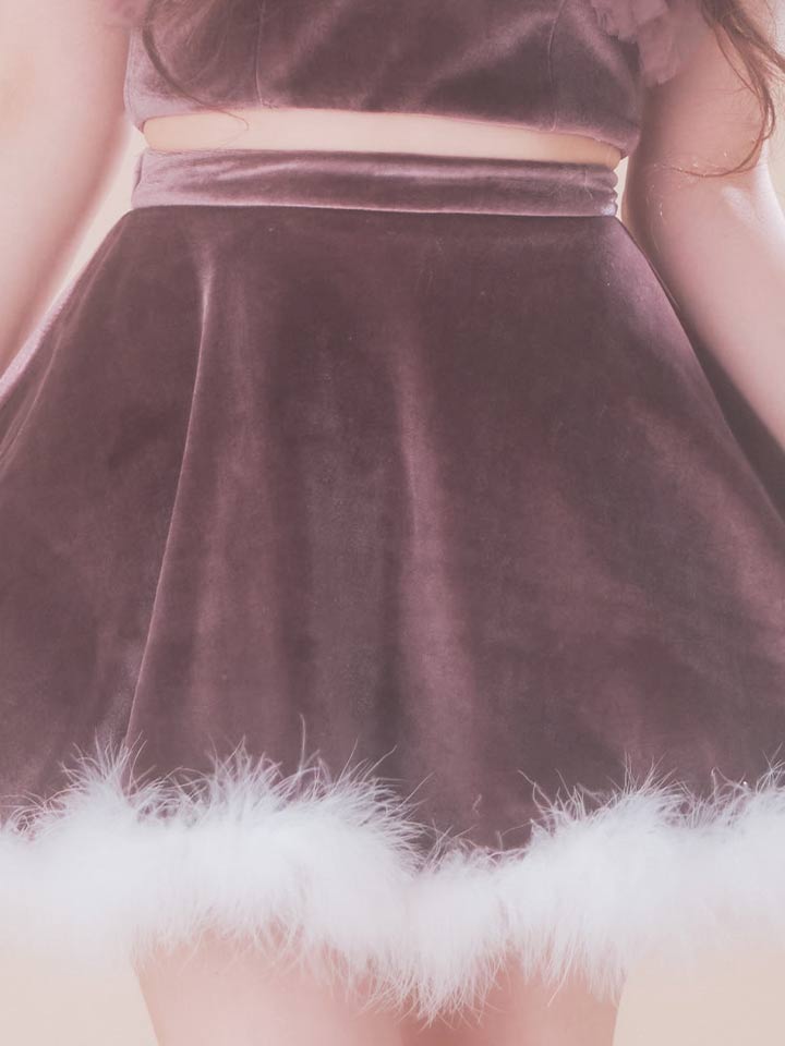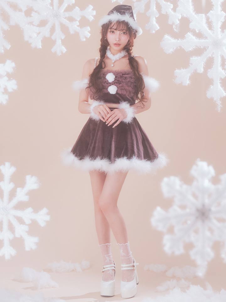 肩やスカート、袖口にあしらったホワイトファーディテールが、