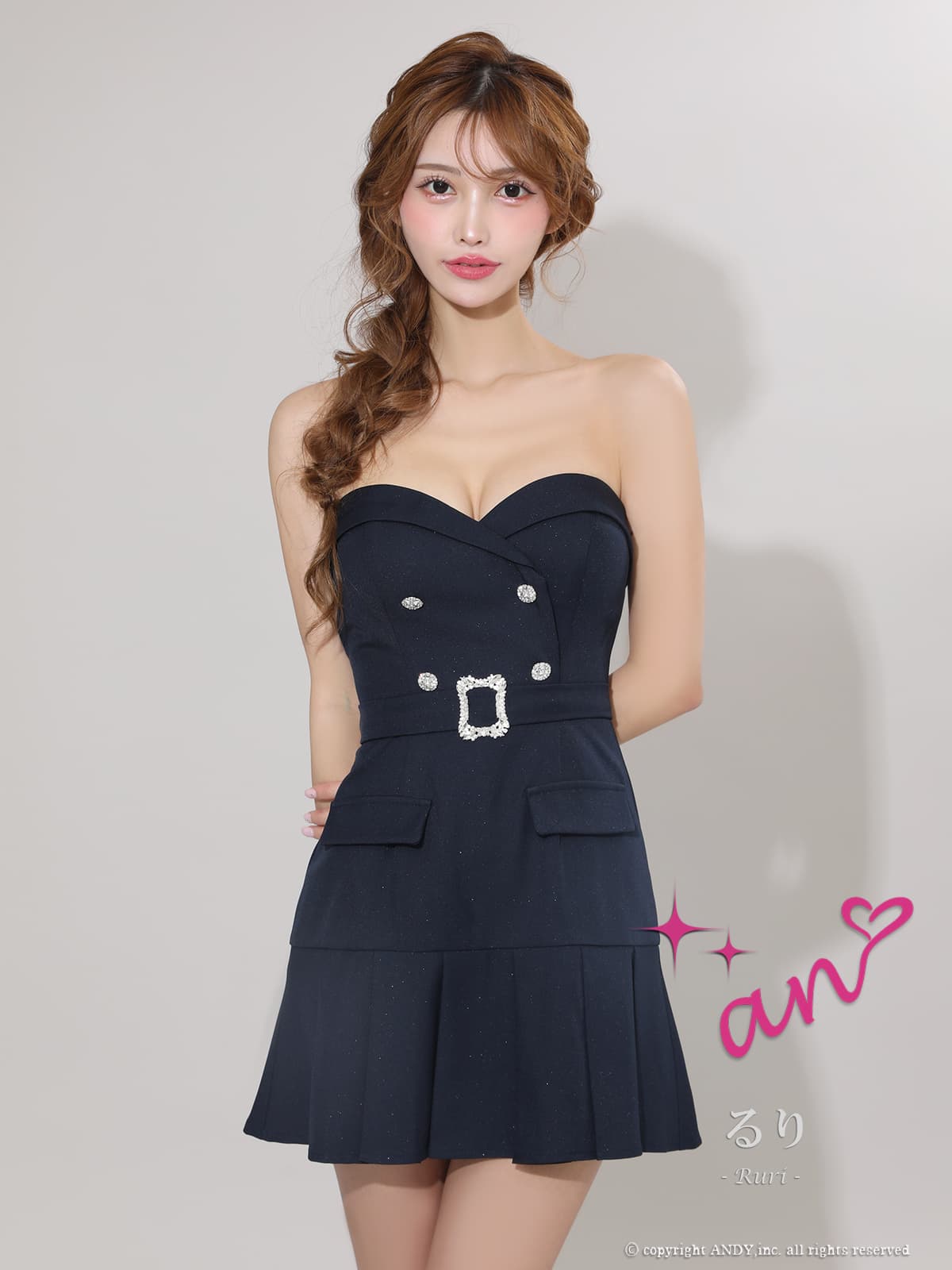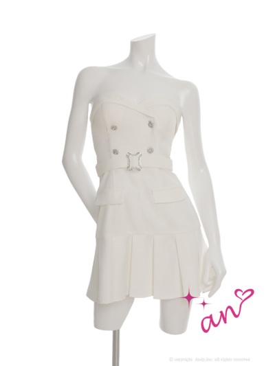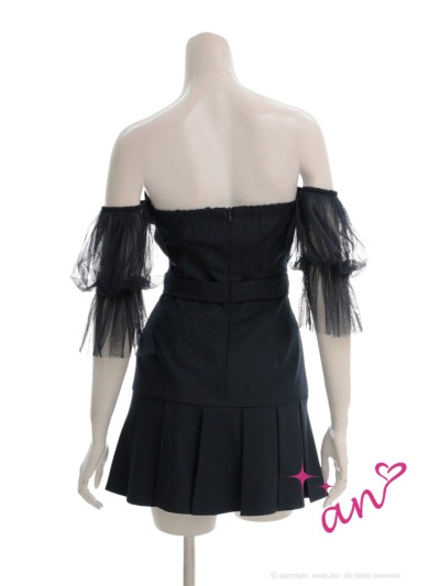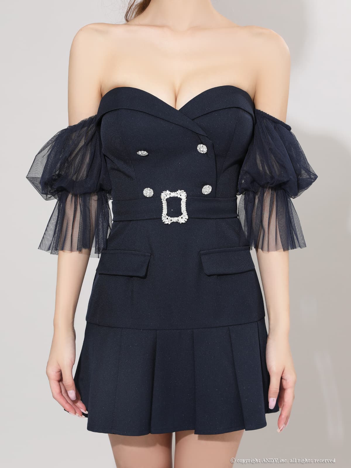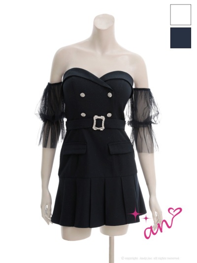 XSサイズあり【an /アン】チュールスリーブ付き/ 袖取り外し可能/ 2way/ ビジューボタン/ ベルト/ プリーツ/ フレア/ ベア/ ミニドレス/ キャバドレス[OF05] [AOC4024-NV-2512]