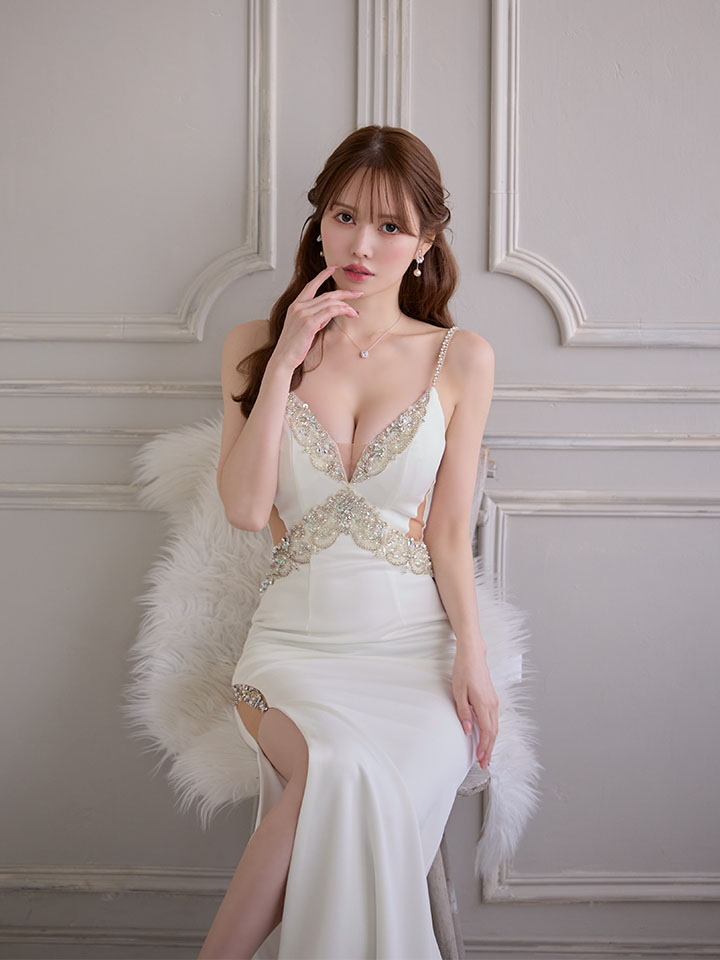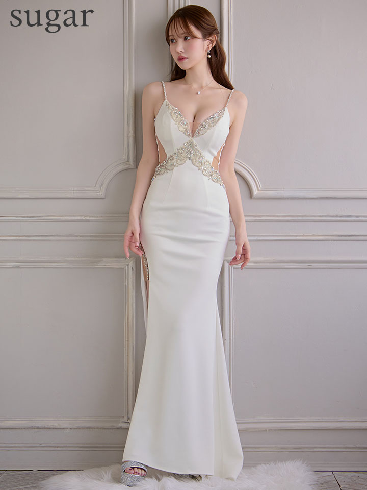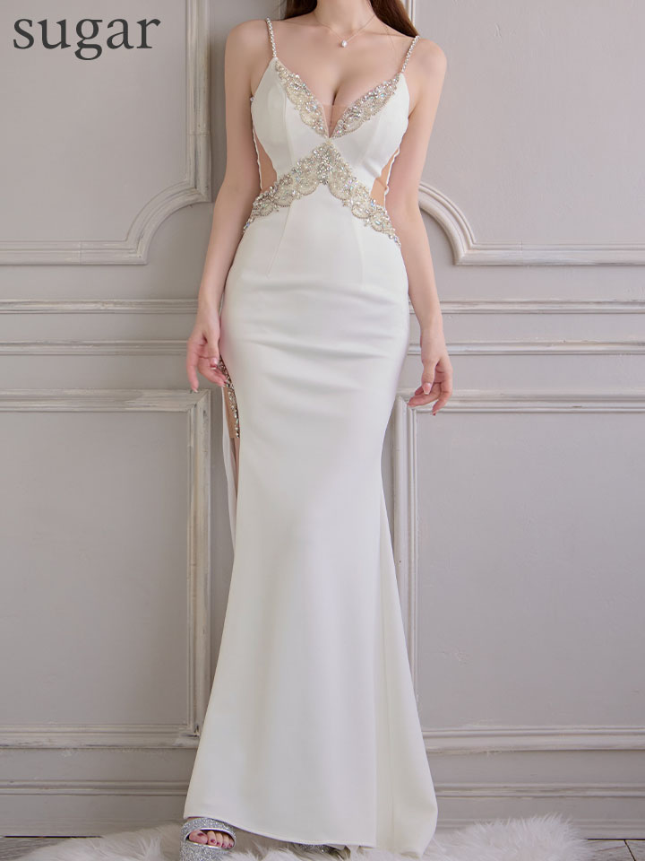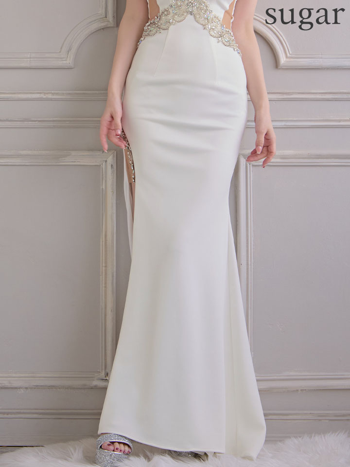 繊細なビジュー使いが上品な煌めきを放つタイトロングドレス。