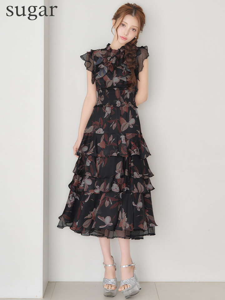 XS-Lサイズあり【SETTAN/セッタン】プチハイネック/ ティアード/ フリルスリーブ/ Aライン/ シフォン/ ワンピース/ ミディアムドレス/ キャバドレス[OF2] [LKS121208-BxBR-S2512]