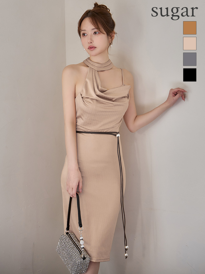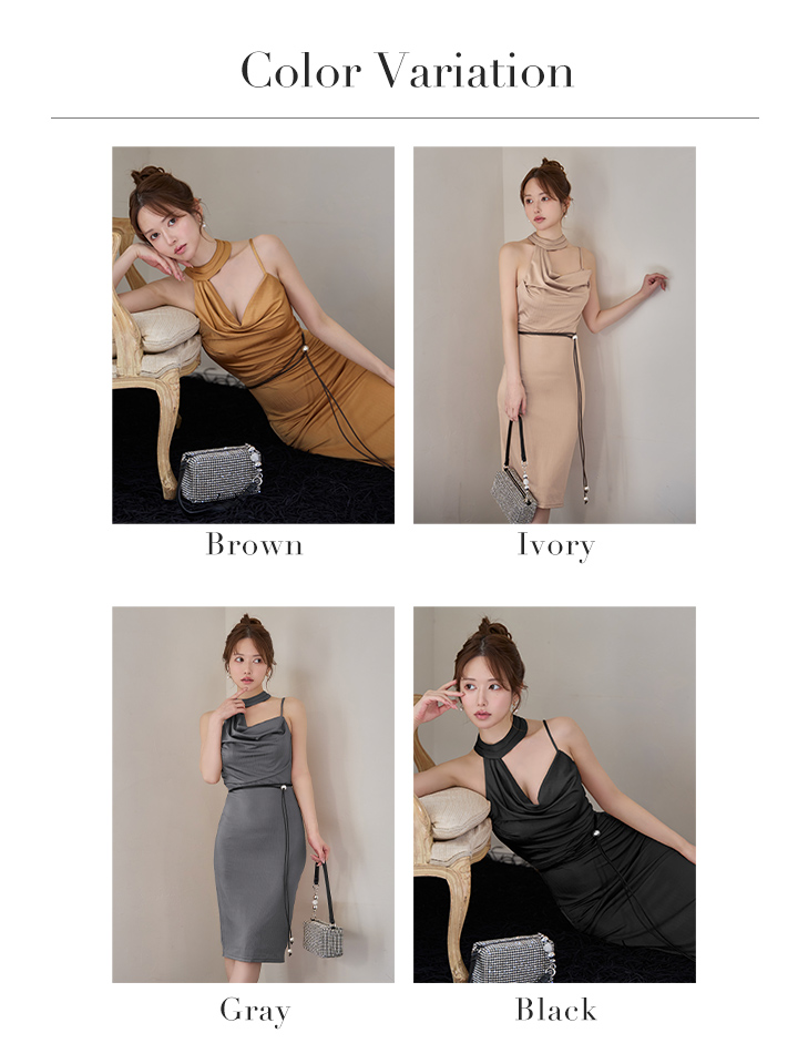 柔らかく流れるドレープネックが、顔まわりを華やかに見せ女性らしさを引き立てます。