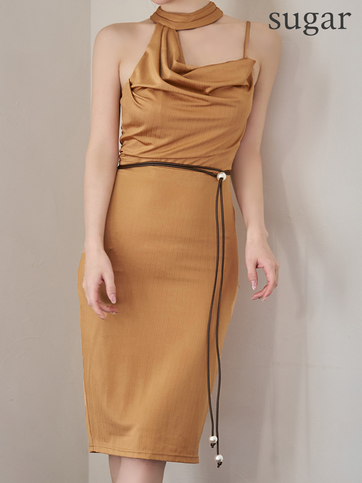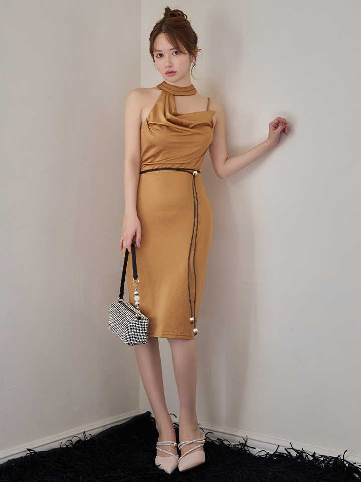【12月上旬-12月中旬発送予定】XSサイズあり【Veautt/ヴュート】【OF05】アシンメトリーネック/ ドレープ/ ベルト/ タイト/ ミディアムドレス/ キャバドレス [VT022528-IV-S251210]