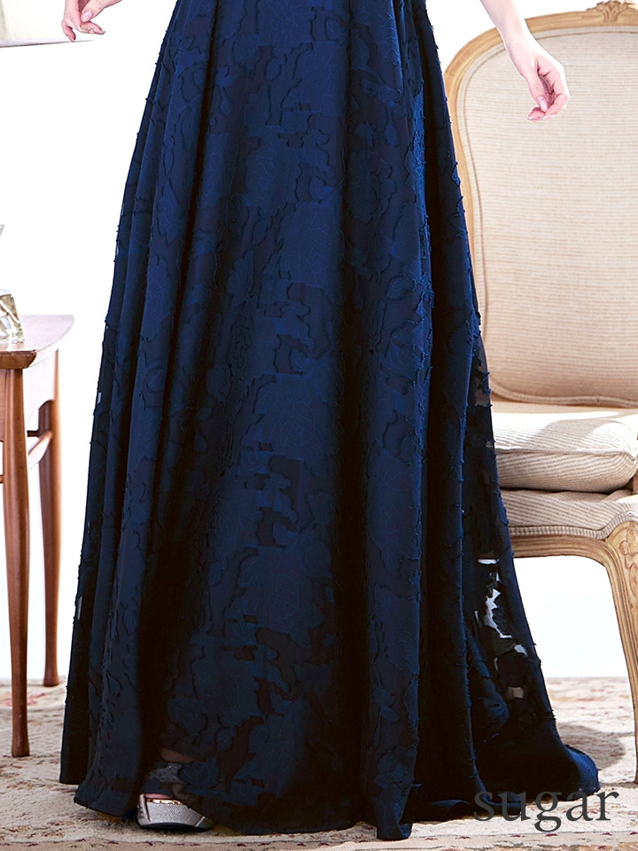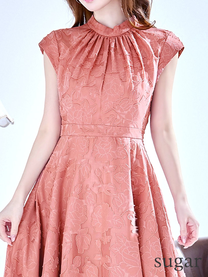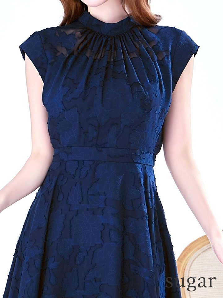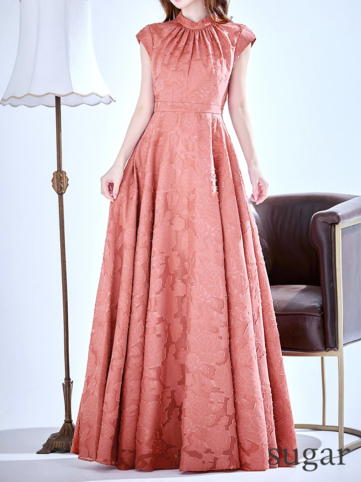 ハイネックにフレンチスリーブがフェミニンで印象的なフレアロングドレス♡