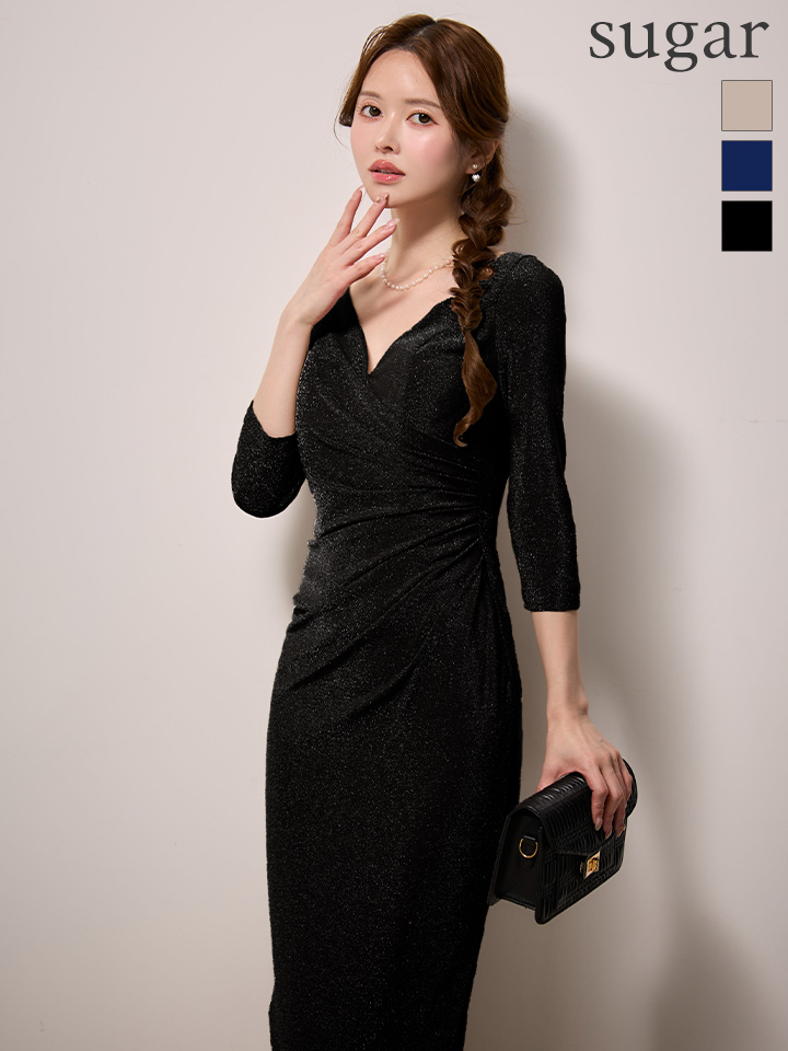 【予約商品/12月下旬-1月上旬発送予定】Lサイズあり【JEAN MACLEAN/ジャンマクレーン】カシュクール/ ラメニット/ 七分袖/ タック/ ひざ丈/ ストレッチ/ タイト/ ミディアムドレス/ キャバドレス[OF2A] [51993-JM-BZ-S251210]