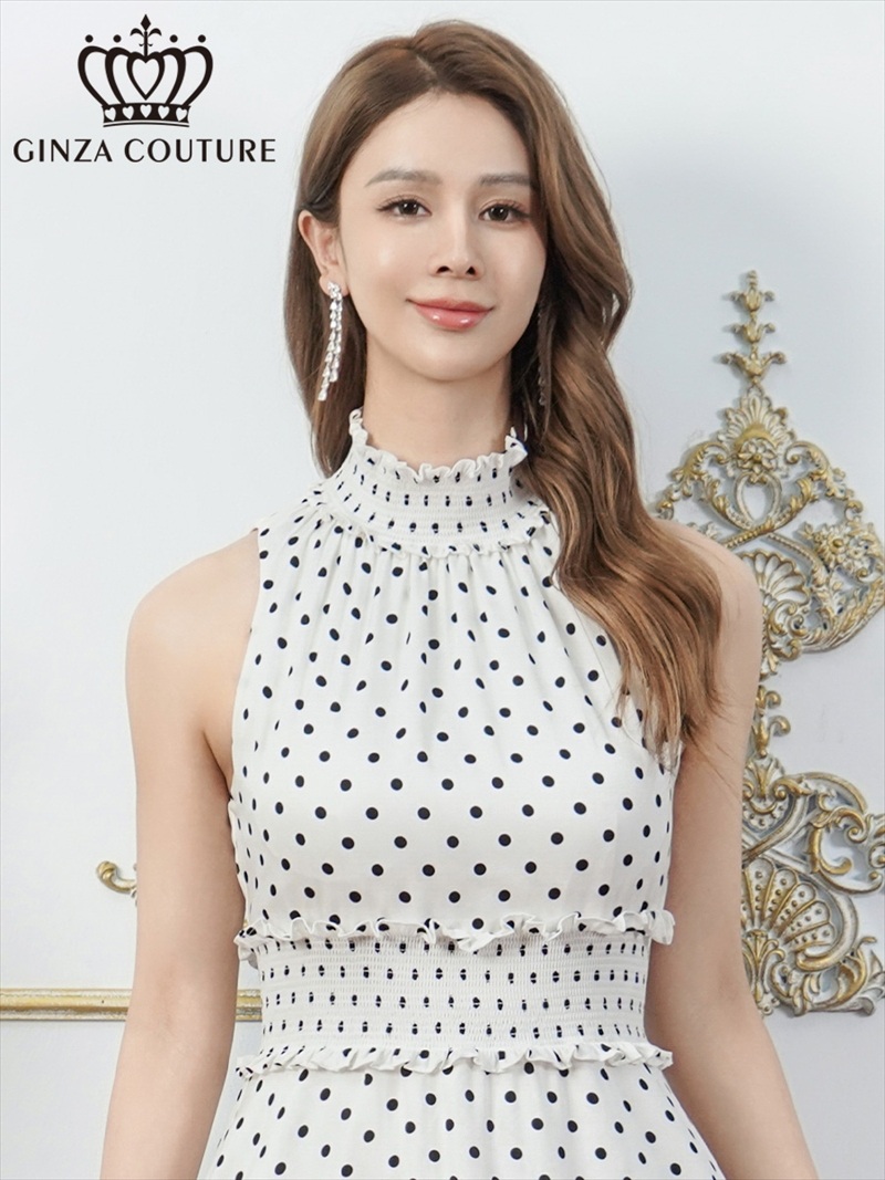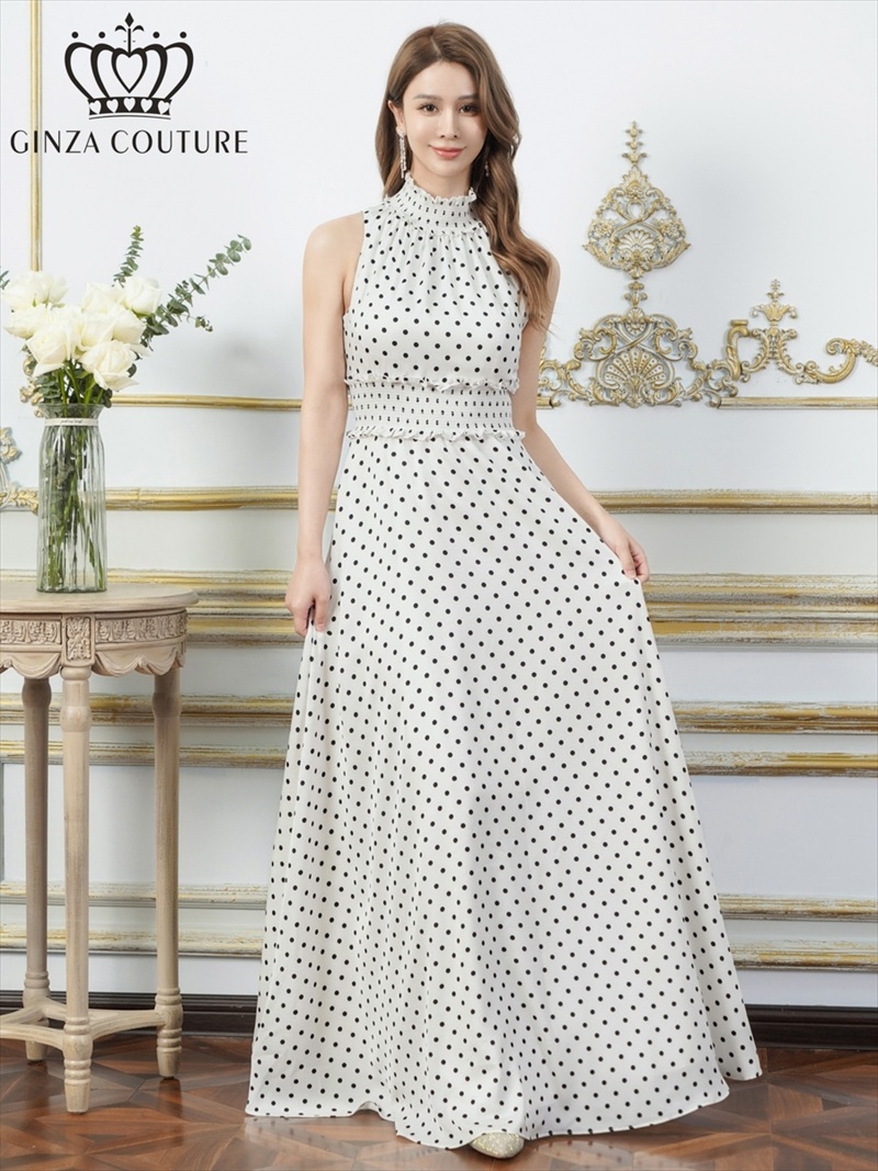 XS-Lサイズあり【ERUKEI エルケイ】ドット/ ネックフリル/ ウエストマーク/ マキシ丈/ アメリカンスリーブ/ Aライン/ ワンピース/ ロングドレス/ キャバドレス long[OF2] [LKC26165-RxW-2512]