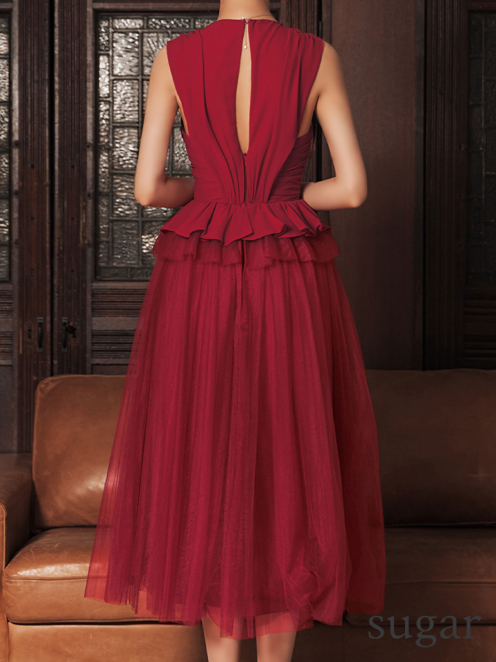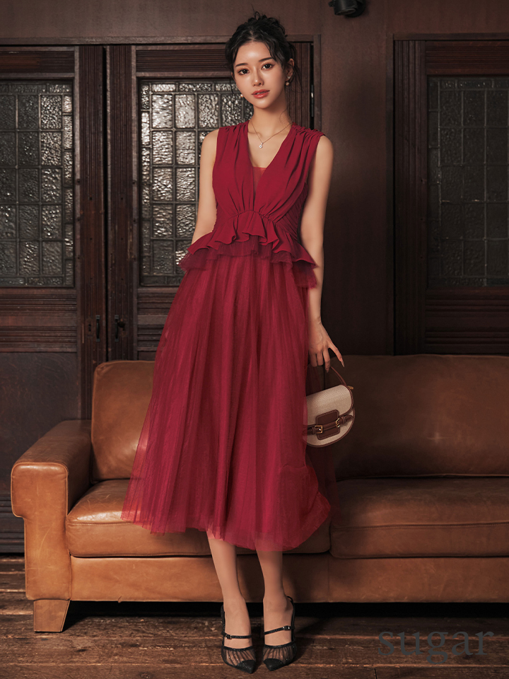 【予約商品/12月上旬-12月中旬発送予定】XSサイズあり【Veautt/ヴュート】【OF05】ノースリーブ/ ウエストフリル/ ペプラムデザイン/ チュール/ シフォン/ ロングフレア/ ミディアムドレス/ キャバドレス [VT082531-W-S251212]