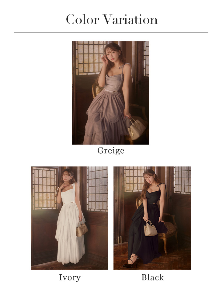 ティアードスカートが優雅に広がり、歩くたびにドラマティックな表情を演出。